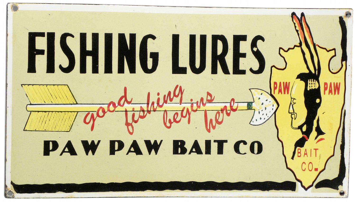 Extremely Rare Paw Paw Bait Company Embossed Porcelain Sign. Entitled, "Good fishing begins here". Small chip at lower left grommet otherwise excellent condition. 19 X 10 inches.