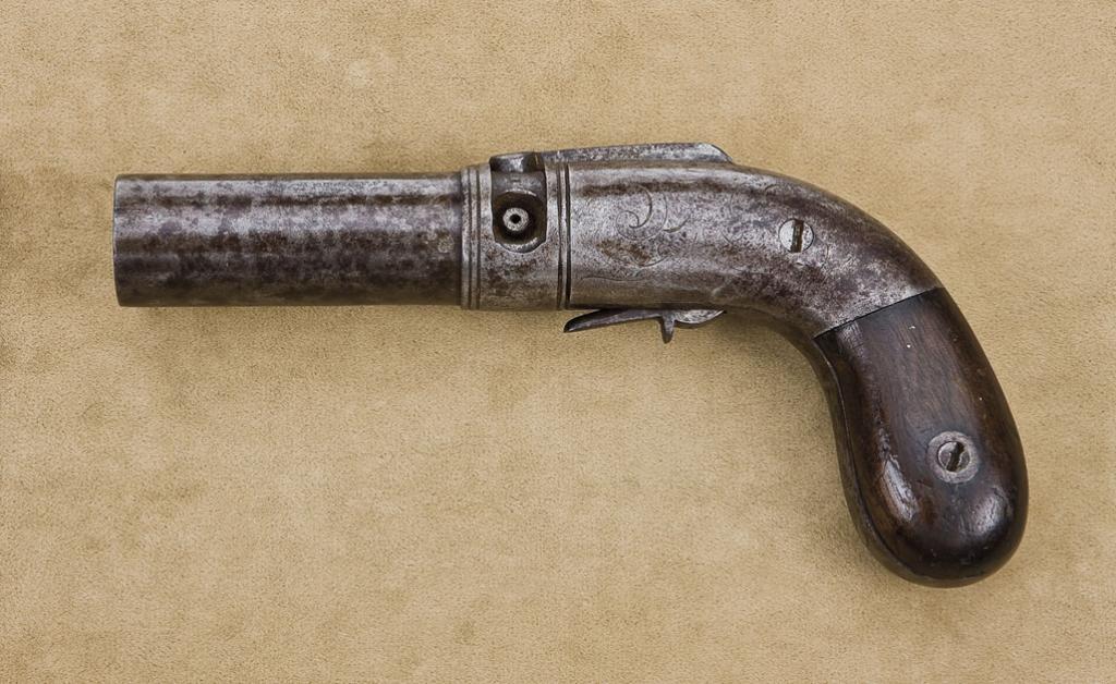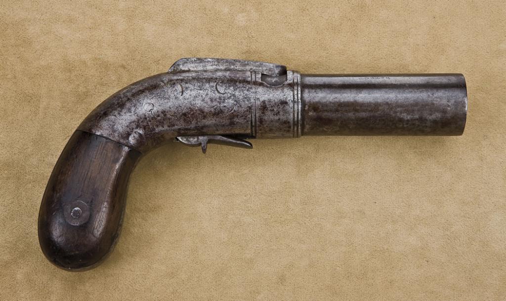 Rare Pecare and Smith pepperbox pistol, four-shot, .28 cal., 2-1/2” barrel group marked “Cast Steel” and “Patent 1849”, engraved frame, wood grips, #13. This gun is in overall good condition showing a brown patina overall with scattered areas of erosion on the barrel and frame; two of the percussion nipples are long missing; the engraving is simple in design and confined to the frame; the action needs adjustment and the grips are worn but good with some knackering to the bottom of each grip. Any Pecare and Smith is desirable to collectors and the “pocket” size variation is particularly hard to find. Est.: $2,000-$4,000.