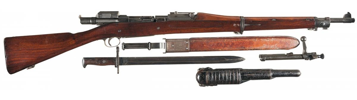 Mark I Pedersen Device manufactured by Remington Arms Co., in 1918 for the Model 1903 Mark I rifle. The device is complete with two 40-round magazines, two boxes of 30 auto pistol cartridges for the Model 1918, a stamped steel carrying case and a five pocket web magazine pouch. The Pedersen Device was a semi-automatic blow back bolt with 40-round magazine chambered for a pistol size .30 caliber cartridge. The device was designed to replace the bolt in the specially modified M1903 Mark I rifle and provide the individual infantryman with a short range semi-automatic rifle capable of providing a high volume of suppressive fire. Adopted by the Ordnance Department in early 1918, Pedersen Devices and M1903 Mark I rifles were designated "Top Secret"; the device itself was designated "U.S. Caliber .30 Automatic Pistol of 1918-Mark I". The Army ordered 100,000 Pedersen Devices for use in the 1919 Spring Offensive against the German Army in France. When WWI ended in November 1918, the 65,000 Pedersen Devices manufactured before the contract was terminated were placed in storage and retained the Top Secret classification. In 1931 the Ordnance Department ordered the Pedersen Devices, magazines, cases and accessories destroyed. Records show that 64,873 Pedersen Devices and accessories were destroyed. Only a few Pedersen Devices exist in collections and museums. The stamped metal carrying case is rarer than the Pedersen Device itself; most surviving devices lack a carrying case. The Pedersen Device has a black-green parkerized finish. The cocking piece has serrated edges and a center sight groove. "U.S.A. 1918-MARK I/11436" is roll-stamped on the left side of the sight groove and "REMINGTON-BRIDGEPORT/PEDERSEN'S PAT's. PENDING" is roll stamped on the right side of the sight groove. The final inspection stamp "E.E.C./Eagle Head/44" is stamped on the back of the cocking piece. One magazine is has a smooth black-green parkerized finish and is stamped with the inspection mark "TP" and the other magazine has a rough parkerized finish with no visible inspection marks. The carrying case has a black enamel finish. The Model 1903 Mark I rifles manufactured for use with the Pedersen device has a special receiver with an oval ejection port in the left side and a shallow clearance cut in the stock below the ejection port. Mark I rifles also had a specially designed magazine cut-off spindle trigger and sear along with the distinctive receiver marking "U.S./SPRINGFIELD ARMORY/MODEL 1903/MARK I". The rifle has been arsenal overhauled and re-finished and has a black green, parkerized finish and oil finished walnut stock. The barrel is roll stamped "SA/Ordnance 'Shell & Flame'/8-20/A" behind the front sight. The left stock wrist is stamped with two arsenal overhaul marks "RA-P" and "AAD" in a rectangle. A circled block "P" proofmark and a block "P" in a rectangle are stamped on the underside of the stock behind the trigger guard. The rifle has a WWI high hump handguard, two bolt "S" stock with grasping grooves and smooth buttplate, WWI rear sight with 2750 yard center notch and straight handle bolt with "C8" steel lot code on the safety lug. The special Mark I cut-off, spindle, sear and trigger are all on the rifle. Following the destruction of the Pedersen Devices in 1931, most Model 1903 Mark I rifles had the special components removed, overhauled and re-issued. The Pedersen Device comes with two original adjustment wrenches. Included with the rifle is an arsenal refinished Springfield Model 1905 bayonet dated 1909 and an unmodified leather scabbard marked "R.I.A./1908/T.C.".