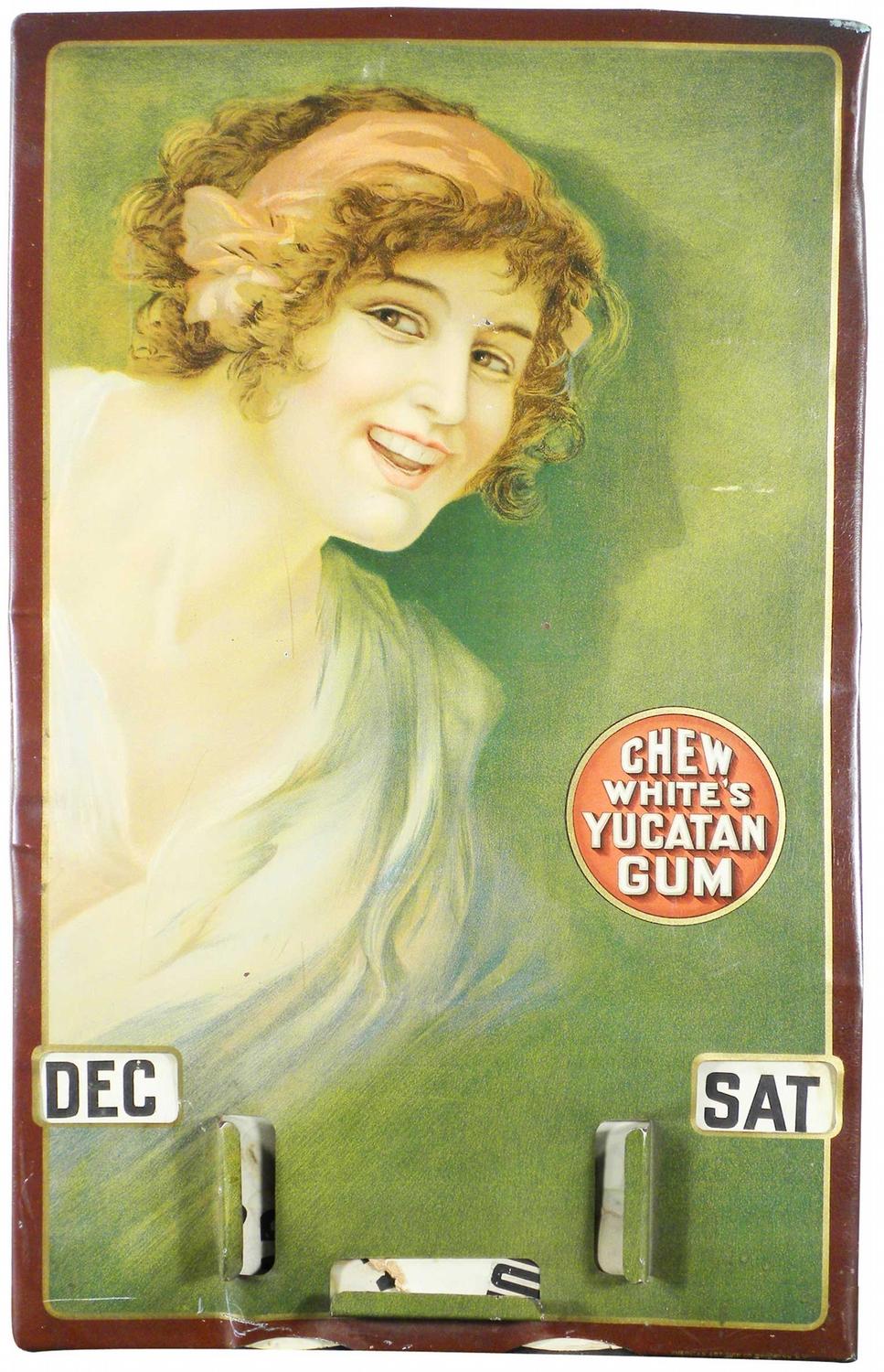 Rare Perpetual Tin Calendar for Yucatan Gum. The only one we have ever seen. Missing day pages. Some minor creases and scuff at 3:00 otherwise very good condition. 12 X 19 1/4 inches.