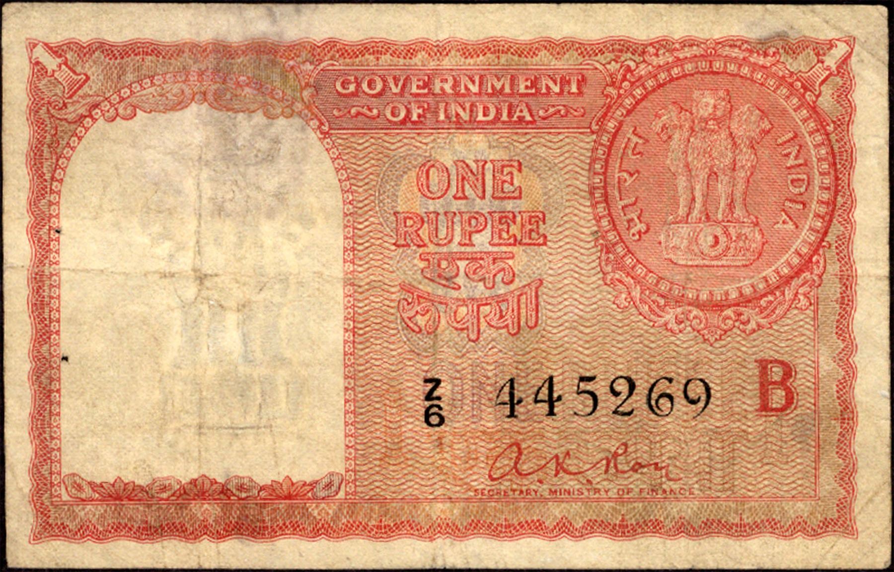 Republic India, 1959, 1 Rupee, Persian Gulf Issue, Signed by A.K. Roy, B Inset, Z Prefix, S. No. Z6 445269, (RM & AM # Z1.1), pin holes, folds, stains, about very fine, Rare.