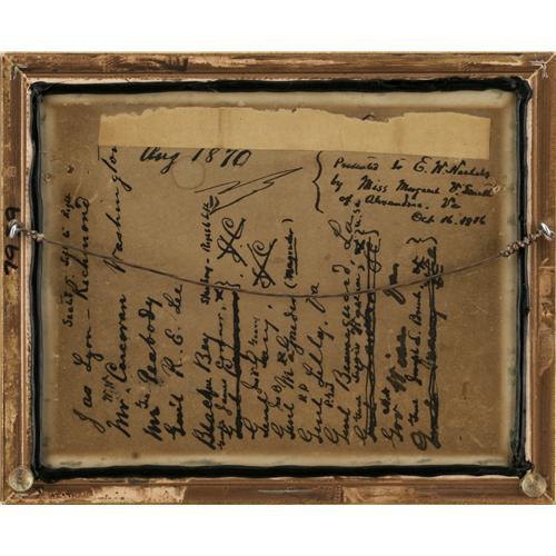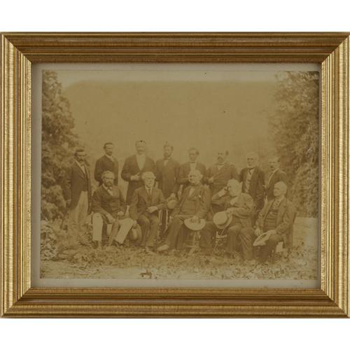 <B>Rare Photo of Robert E Lee and Confederate Officers.</B></I> Very rare albumen photograph, 7.5" x 5.75", of General Lee and his Confederate officers in their first meeting since Appomattox, taken at White Sulphur Springs, West Virginia, in August 1869, where they met to discuss "the orphaned children of the Lost Cause". Gen. Beauregard, Gen. G.W.C. Lee, Gen. Lawton, Gen. Henry Wise, Gen. Gary, Gen. Lilley, Gen. Conner, Gen. Brent of Louisiana and Gen. Magruder of Texas are depicted with Mr. Corcoran, (namesake of Corcoran Museum) a philanthropist from Washington, D.C., and George Peabody (namesake of Peabody Museum), Mr. Jasper Lyon of Richmond, among others. This perhaps the most remarkable photograph of Robert E. Lee in existence, and it is the only from life photograph of Lee with his Generals in existence, during the war or after. The original owner dockets it on verso shortly after it was taken in 1869. Without a doubt, the rarest photograph of Lee.