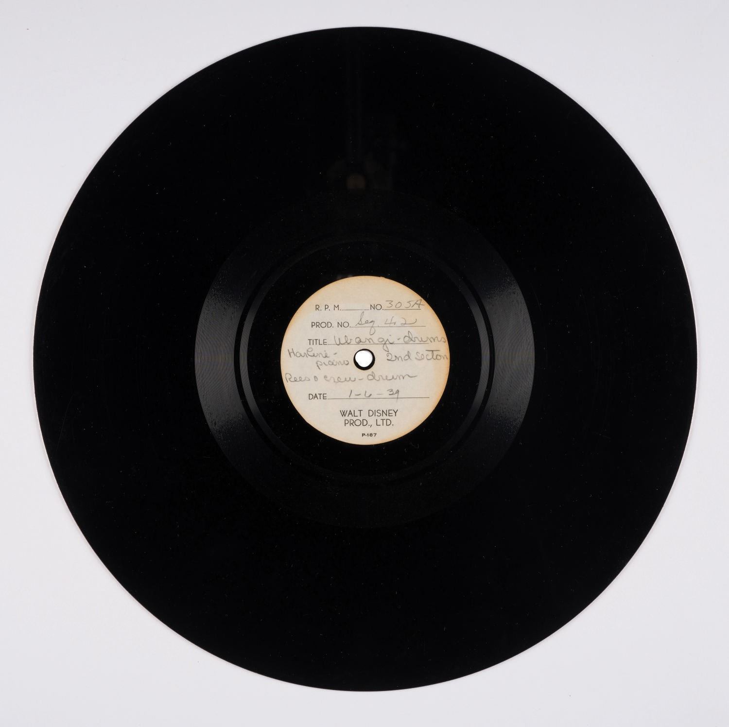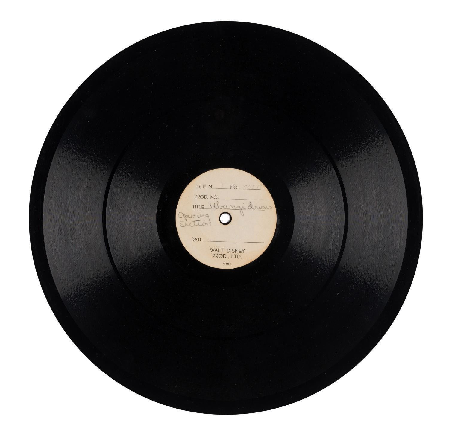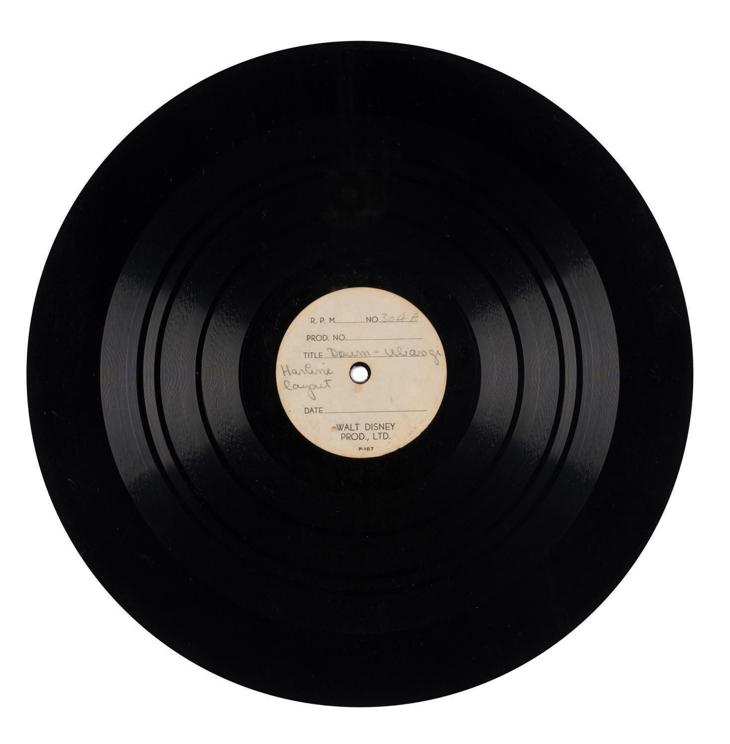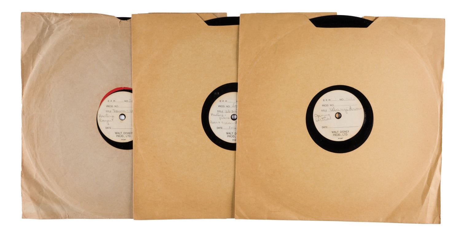 (Disney, 1939) An extremely rare collection of (3) acetate recordings containing deleted tracks for Walt Disney's "Pinocchio". The acetates feature tracks of "Ubandi Drums." These tracks were intended for a deleted verse of "I've Got No Strings." One acetate was recorded on "1-6-39," one is labeled "Hal Rees," one "Harline layout," and another "Harline Piano Rees & Crew." Measuring 12", the records are in very good condition, exhibiting scratches from use.