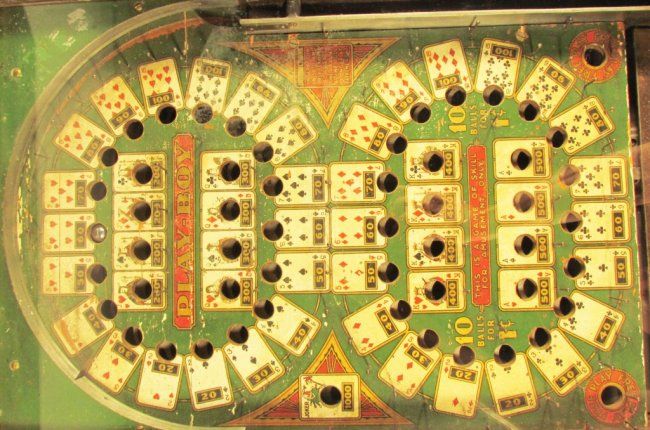 Rare "Play-Boy" Card Suit Motif Pinball Machine. Coin operated one cent play. Some minor wear and discoloration to playing face otherwise good working condition. 16 X 24 X 9 inches.