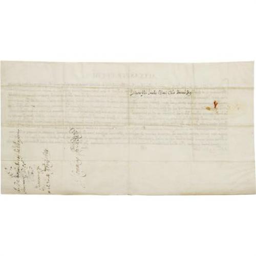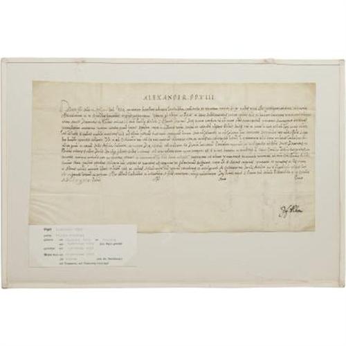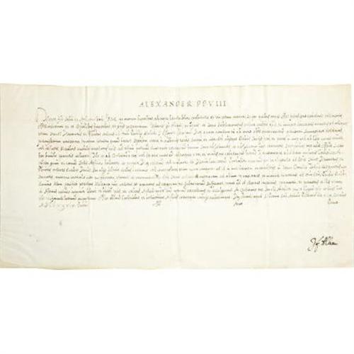 <B>Rare Pope Alexander VIII Brevis Signed by Future Pope Clement XI,</B></I> one page with docketing, 15.75" x 8", probably the Vatican, October 19, 1689. Untranslated from the Latin, very fine condition. Quite rare given Alexander's brief reign lasting under two years. Born Pietro Vito Ottoboni (1610-1691), Pope Alexander VIII did not assume the papacy until age eighty. The signature of Cardinal Giovanni Francesco Albani is located at the lower right of the front of this brevis. Cardinal Albani would be elevated to the papacy in 1700, becoming Pope Clement XI.<BR><BR><b>Shipping:</b> Large Flat (<a target="_blank" href="http://www.heritageauctions.com/common/shipping.php">view shipping information</a>)