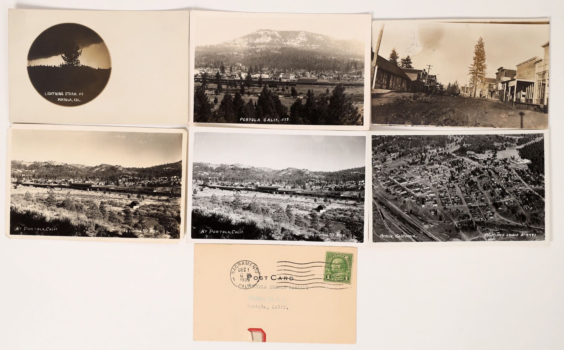 Lot of 7. Mostly wht. frame. Calif. State Library Post Card notice of books sent 1939. Postmarks: Sacramento. Three street level distant views of Portola. One street scene of the town. One Birdseye view of Portola. A lightening storm. All in protective sleeves. California Portola 1915 era Ken Prag Collection
