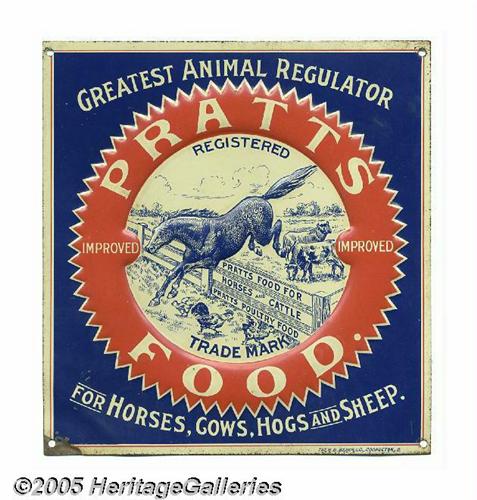 <B>Rare Pratts Food Veterinary Sign by the H. D. Beach Co.</B></I> Never before seen, and made by one of the earliest Ohio advertising lithographers, this Pratts Food embossed sign shows healthy animals in the field. A constant concern of vets and farmers during the turn of the century was the health of their animals, so it is no surprise that the advertising depicting the maladies of farm stock would become one of the most active areas in antique advertising. A raised circle with company logo frames an embossed horse bounding over a fence with "PRATTS FOOD FOR HORSES AND CATTLE" on the fencing. Collectible in their own catagory are advertising pieces manufactured by the early lithographers of Coshocton, Ohio with the works of the H. D. Beach Co. topping the list. The combination of rarity, content and excellent production make this sign one of the most unique offered to date. Light edge scuffing and a scrape on the bottom left corner in no way affect the near mint look of this possibly one-of-a-kind advertising sign. Approximately 6 3/4" square. Small but powerful! Lot:252