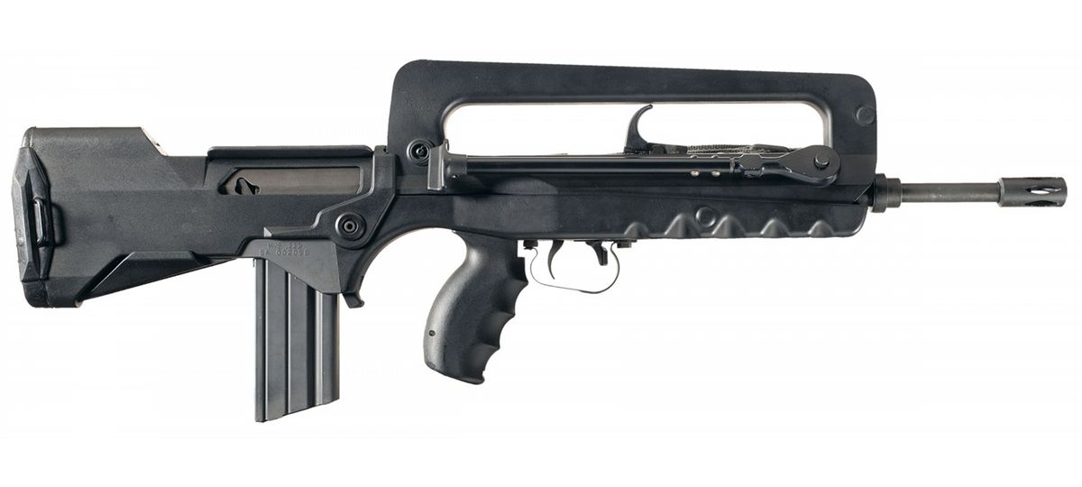 This is a very nice and extremely RARE Commercial copy of the French FAMAS semi-automatic Bullpup rifle. This rifle is the French equivalent of the American M4 Carbine and still is the standard Infantry service rifle in France today. These rifles were designed and manufactured in the French MAS arsenal at St. Etienne. The most unique thing obviously is that these rifles are of a Bullpup design. This concept was intended to provide a full size rifle barrel and action in a very short and compact rifle by shortening or eliminating the stock and moving the action to the rear. Thereby considerably reducing the overall length, this rifle is only 30 inches long overall. This concept did not receive support in most countries and only a handful today actually use the Bullpup rifle design, France, England and Austria among them. The right side of the receiver is marked "MAS223" over the serial number and the left side of the receiver is marked "MANUFACTURE NATIONALE D' ARMES, DE SAINT ETIENNE, MADE IN FRANCE, CENTURY ARMS, ST. ALBANS VT." The rear sight has single large battle sight with a large aperture with two different size flip up peep sights, one in front and one behind the large aperture. The front sight has a standard blade front that is also adjustable for windage and includes a unique push up quick point type night sight in front of the front sight post all housed inside the long carrying handle. The charging handle is located directly below the carrying handle. With a fold-down bipod mounted on the sides of the receiver and a factory bird cage flash-hider. The rifle is designed to be adaptable to either a left or right handed shooter by removing the ejection port cover and switching it to the other side of the rifle. It also has an ambidextrous safety to accommodate either style shooter. It is estimated that only 50-100 of these rifles were imported into the US before the Assault rifle ban stopped their importation. Consequently this is a VERY RARE rifle today. The FAMAS Bullpup is the pictured cover story in the October, 1988 Gun World magazine, page 18, entitled "The Fetching Famas" by Chuck Karwan. Complete with a original web sling, a Galati Intl. soft case, one extra magazine, two FAMAS magazine pouches, a cleaning kit and a FAMAS bayonet and scabbard.