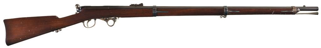 This is an exceptional rare and very unique Greene breech loading "bolt action" rifle as manufactured by the A. H. Waters Company circa 1859/60. This rifle was the very first "bolt action" rifle ever purchased by the U.S. Ordnance Dept. It is really a very interesting percussion rifle in that it used a black powder paper cartridge with this very modern and certainly forward thinking bolt action mechanism, that was developed prior to the Civil War. The U.S. Ordnance Dept. purchased approximately 900 of these rifles with very few being actually used. After the Civil War a large quantity was sold to various state militias by the Boston company of William, Reed and Sons. This rifle actually has "dual locking lugs" that are used on the turn-bolt design. Instead of having a firing pin in the bolt it employed a pusher rod to seat the paper cartridge with a underhammer percussion cap mechanism. The rifle has a 36 inch barrel that uses a oval bore with a very shallow rifling method developed by Charles Lancaster, a London gunmaker. This shallow rifling was probably the most effective for black powder shooting as it would spin the bullet/ball sufficiently to provide good accuracy, but not so deep that it caused a lot of powder fouling. Certainly a rifle that was way ahead of its time, and probably the reason why the Ordnance Dept didn't use many of them. The only markings on the rifle are on top of the upper tang which reads "GREENE PATENT/NOV. 17 1857". There are no U.S. inspectors proofs or marks so its assumed this maybe one the rifles sold to a State militia. It has the all blue parts with a color casehardened hammer/ring mechanism. The rifle has a full length walnut stock with two barrel bands and the original steel cleaning rod. The butt-trap compartment contains an original soft-bristle bore brush.