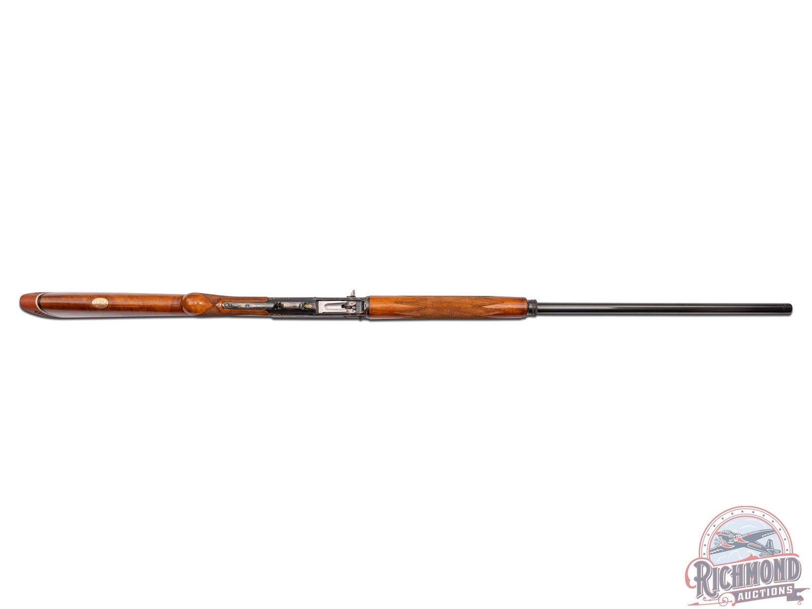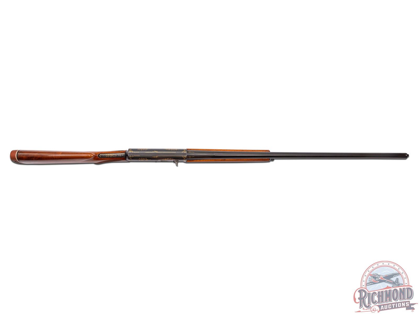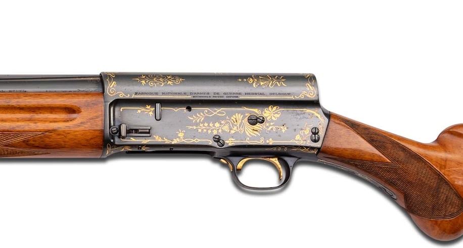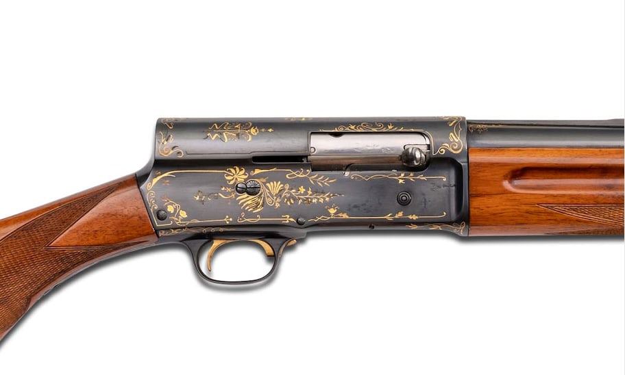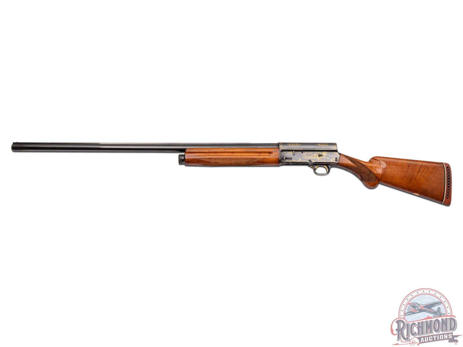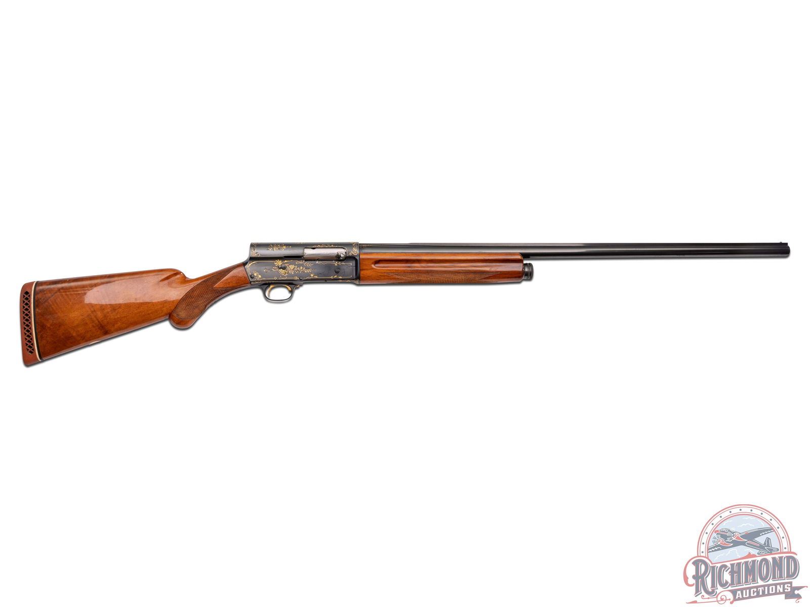 Made in Belgium by Browning in 1925. These Pre-World War II high grade Browning's are extremely rare especially in this condition. 32" blued Special Steel barrel with matted hollow raised rib, bead front sight, and Browning Ogdon, Utah address markings with Grade IV gold work at breech. Barrel is choked full with 2-3/4" chambers. Barrel is numbered "150314" and receiver is marked "70894"(not unusual). Blued semi-automatic frame with "Art Deco" style Grade IV gold work, gold washed trigger, and gold washed safety. Light tone walnut checkered round knob pistol grip stock with long tang, added white-line pad and German silver oval vanity plaque with initials "A.B.H.". Matching checkered walnut forearm. LOP: 15-1/4". DAC: 1-1/4". DAH: 2-1/4". CALIBER: 12 GA. S/N: 70894. FFL STATUS: Curio & Relic.