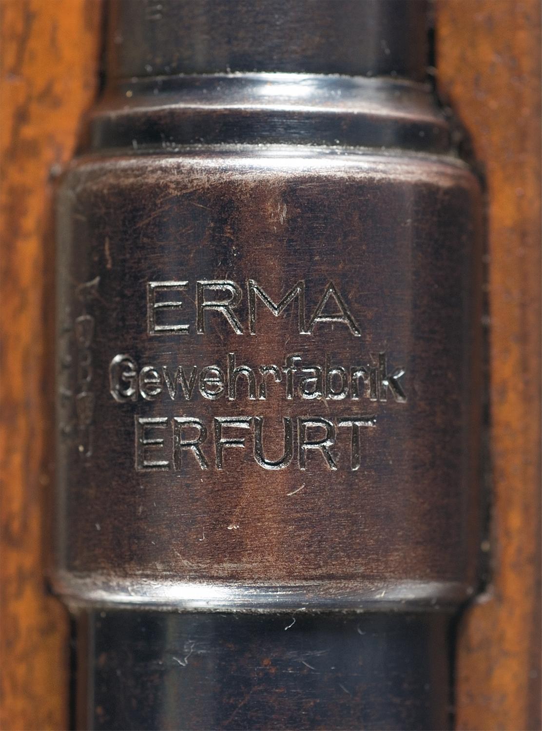 The chamber is marked "ERMA / Gewehrfabrik / ERFURT", with two crown/letter proofs and serial number on the left side. A pair of crown/letter proofs are also present on the barrel at the breech. Inverted "V" and tangent sights, with faux cleaning rod. The left side of the buttstock has a rare SA cartouche: the SA logo surrounded by "GRUPPE THURINGEN". Smooth pistol grip stock with "SA. GR. TH." (SA Gruppe Thuringen) marked in red paint on the left side of the forearm between the barrel bands and shotgun style buttplate.