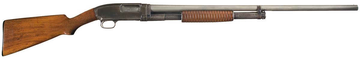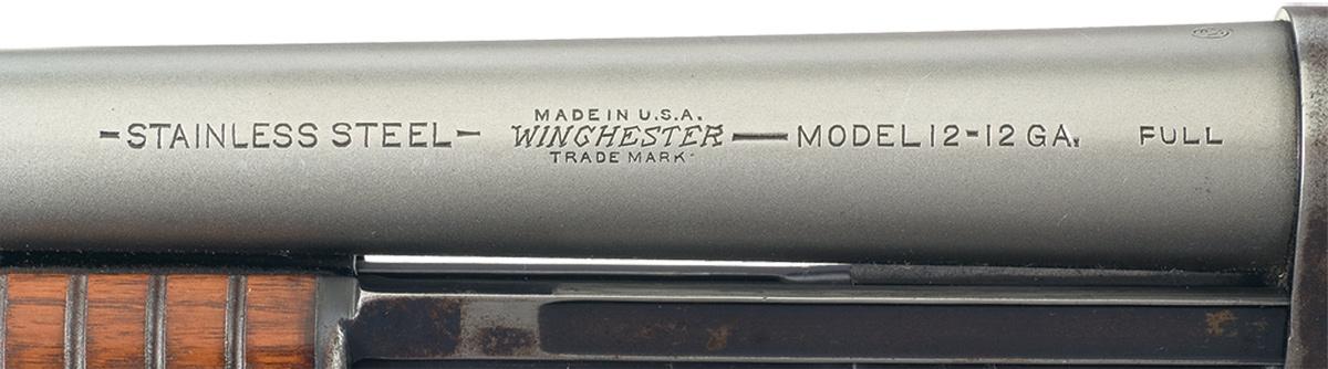 Manufactured in 1927, this version of a 12 gauge Winchester Model shotgun has a rear stainless steel barrel. The barrel has a single bead sight and is marked "-STAINLESS STEEL- [three line Winchester trademark] - MODEL 12-12 GA. FULL" on the left side and the two line address/patent dates marking on the right side. Standard receiver with serrated top. Single factory proofs on the barrel and receiver. 18 groove forearm and pistol grip stock with Winchester hard rubber buttplate. Length of pull is 13 3/4". The stainless steel barrels were Japanned and this finish quickly wore through leaving a spotted finish and were not very popular. Since stainless steel barrels were not popular and were available for a comparatively short time, all Winchesters with these barrels are very rare and valuable collectors items.