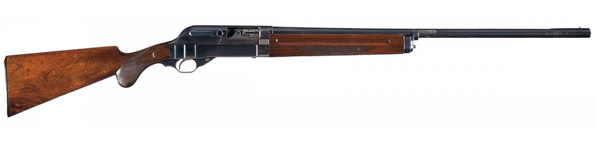 This is a scarce example of a Walther semi-automatic shotgun that saw a limited production run prior to WW II. The magazine tube is housed in the forearm and the toggle link mechanism is operated by a lever on the right side of the receiver. Left side of barrel marked "CAL 12-65m/m = 2 1/2" KRUPPSTAHL" and receiver marked "WALTHER'S PATENT". Bead front sight and checkered round knob pistol grip stock with serrated horn buttplate. Length of pull is 14 1/4 inches.