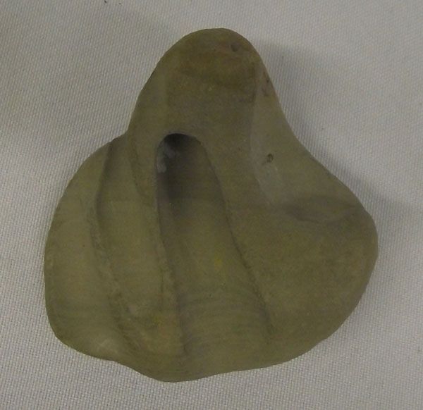 Prehistoric Mimbres Preform Bird Arrow Straightener, made from beautifully striped slate, multi-use stone slate tool includes drill hole, three smoothing grooves on one side, large and small smoothing grooves on other side. Most Mimbres arrow straighteners are single grooved which makes this piece so unique and rare, measures approx. 2.5''L x 2.75''W. Aquired in accordance with all State and Federal Regulations