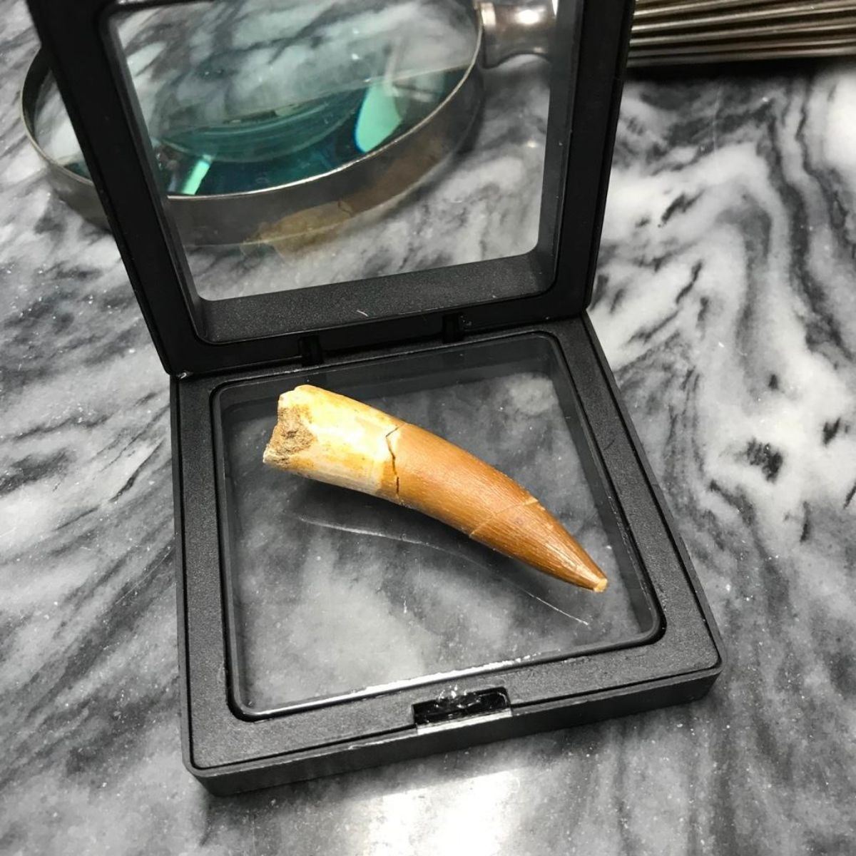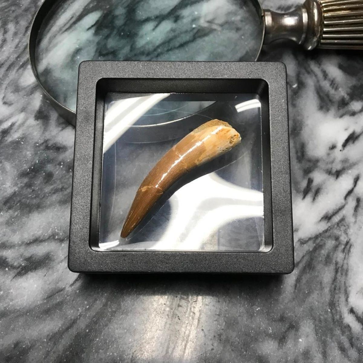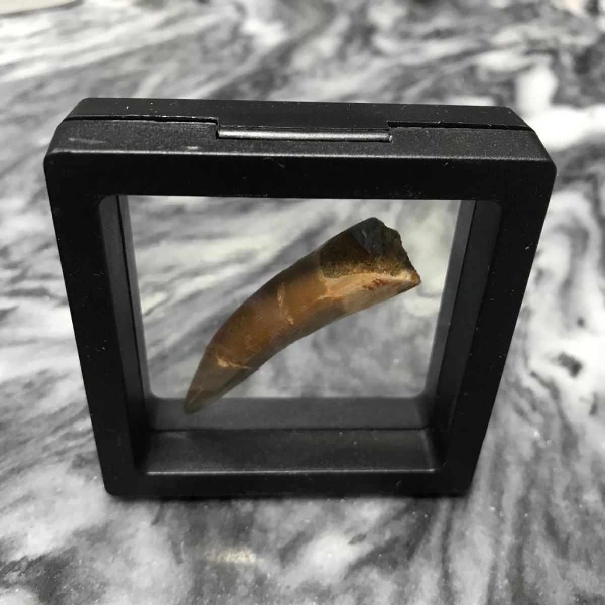 Rare & natural Zarafasaura Oceanis tooth fossil, from the late Cretaceous Era, 72 to 66 million years ago, quarried in the Oulad Abdoun Basin, Morocco. The tooth measures around 5.25cm or 2 1/16" at its biggest, & came out of the Earth in two or more pieces and was repaired. Comes in museum display case. The Plesiosaur Zarafasaura Oceanis was a marine reptile predator that roamed the Earth's seas during the age of the dinosaurs and grew to around 7 meters or 23 feet in length. Â