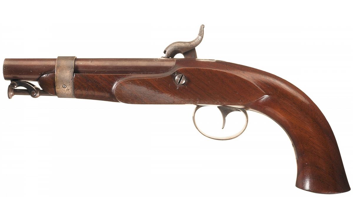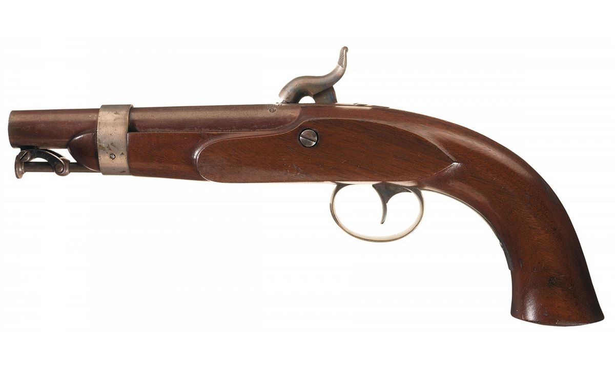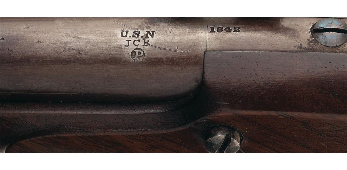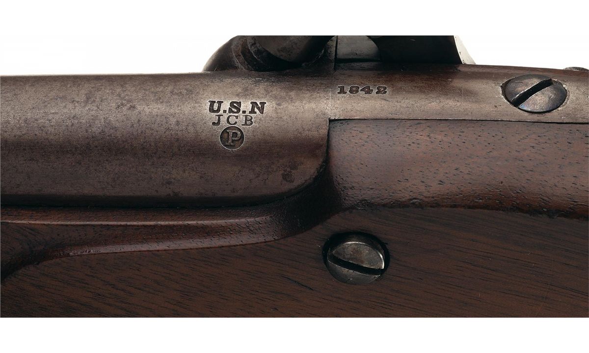 A) Manufactured by N.P. Ames of Springfield, Massachusetts and Henry Derringer of Philadelphia circa 1842 to 1847, these pistols are also known as the Model 1842 or Navy Box Lock Model with an estimated 2,000 pistols manufactured in all. The Model 1842 was the first U.S. martial percussion pistol produced under contract for the government. Ames delivered 300 of these pistols to the government before the contract was signed. These two pistols were part of the first 300 Ames delivered in 1842. The very early production examples, such as these two pistols, featured a raised lock plate with a beveled edge along the front and a high rounded shape at the rear which terminated in a point. The lock plates are marked "U.S.N./1842" vertically at the rear and "N.P. AMES/SPRINGFIELD/MASS" in the center. The barrel tang is also dated "1842" and the left rear of the barrel is stamped "U.S.N./JCB" above a circled "P." The grip is slender and a bit longer than the later production pistols. These pistols also have features that make them presentation models, or pistols intended for someone outside the standard government contract. These features include the silver plated brass butt cap, trigger guard, and front barrel band and a walnut stock without an inspection cartouche. The pistols are fitted in a walnut case and contain several accessories including two double face eagle brass flasks, a triangular shaped combination tool, and two cap tins. Although these pistols lack a presentation engraving, the silver plating and the lack of stock inspection marks are features that indicate that these pistols were intended for some one of importance. These pistols were purportedly the personal property of a War of 1812 U.S. naval officer, George C. Reed. Born in Glastonbury, Connecticut, in 1788, George C. Reed joined the United States Navy as a midshipman at the age of 16 and joined the crew of the USS Constitution under the command of his uncle, Capt. Hugh G. Campbell, in 1806. Promoted in Lieutenant after 6 years of service, Reed was still aboard the USS Constitution during the War of 1812 when the ship defeated the British warship HMS Guerriere on August 19, 1812. Reed boarded the British vessel to accept her surrender. On October 25, 1812, Reed, now aboard the USS United States under the command of Commodore Stephen Decatur, participated in the defeat of the British warship HMS Macedonian. The Naval History & Heritage Command website confirms that Reed was an officer aboard the United States when the ship saw action with the Macedonian. During the Algerian War of 1815, Reed commanded the USS Chippewa and was later promoted to Commander, serving in the Mediterranean and off the coast of Africa before he was promoted to Captain in 1825 to take command of the USS Constitution. In the late 1830s he participated in actions against pirates and raiders preying on American shipping to India and commanded the Second Sumatran Expedition, a punitive expedition by the U.S. Navy against inhabitants of the island of Sumatra in response to the massacre of the crew aboard the American merchant ship Eclipse. He commanded the Philadelphia Naval School from 1839-1846, commanded the African Squadron from 1846-1847 and the Mediterranean Squadron from 1847-1849. Reed was promoted to Rear Admiral in July 1862 but died one month later.