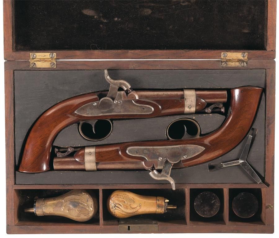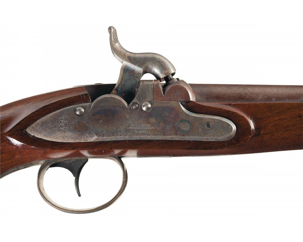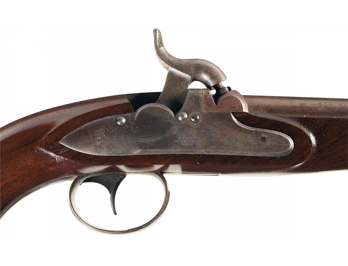 A) Manufactured by N.P. Ames of Springfield, Massachusetts and Henry Derringer of Philadelphia circa 1842 to 1847, these pistols are also known as the Model 1842 or Navy Box Lock Model with an estimated 2,000 pistols manufactured in all. The Model 1842 was the first U.S. martial percussion pistol produced under contract for the government. Ames delivered 300 of these pistols to the government before the contract was signed. These two pistols were part of the first 300 Ames delivered in 1842. The very early production examples, such as these two pistols, featured a raised lock plate with a beveled edge along the front and a high rounded shape at the rear which terminated in a point. The lock plates are marked "U.S.N./1842" vertically at the rear and "N.P. AMES/SPRINGFIELD/MASS" in the center. The barrel tang is also dated "1842" and the left rear of the barrel is stamped "U.S.N./JCB" above a circled "P." The grip is slender and a bit longer than the later production pistols. These pistols also have features that make them presentation models, or pistols intended for someone outside the standard government contract. These features include the silver plated brass butt cap, trigger guard, and front barrel band and a walnut stock without an inspection cartouche. The pistols are fitted in a walnut case and contain several accessories including two double face eagle brass flasks, a triangular shaped combination tool, and two cap tins. Although these pistols lack a presentation engraving, the silver plating and the lack of stock inspection marks are features that indicate that these pistols were intended for some one of importance. These pistols were purportedly the personal property of a War of 1812 U.S. naval officer, George C. Reed. Born in Glastonbury, Connecticut, in 1788, George C. Reed joined the United States Navy as a midshipman at the age of 16 and joined the crew of the USS Constitution under the command of his uncle, Capt. Hugh G. Campbell, in 1806. Promoted in Lieutenant after 6 years of service, Reed was still aboard the USS Constitution during the War of 1812 when the ship defeated the British warship HMS Guerriere on August 19, 1812. Reed boarded the British vessel to accept her surrender. On October 25, 1812, Reed, now aboard the USS United States under the command of Commodore Stephen Decatur, participated in the defeat of the British warship HMS Macedonian. The Naval History & Heritage Command website confirms that Reed was an officer aboard the United States when the ship saw action with the Macedonian. During the Algerian War of 1815, Reed commanded the USS Chippewa and was later promoted to Commander, serving in the Mediterranean and off the coast of Africa before he was promoted to Captain in 1825 to take command of the USS Constitution. In the late 1830s he participated in actions against pirates and raiders preying on American shipping to India and commanded the Second Sumatran Expedition, a punitive expedition by the U.S. Navy against inhabitants of the island of Sumatra in response to the massacre of the crew aboard the American merchant ship Eclipse. He commanded the Philadelphia Naval School from 1839-1846, commanded the African Squadron from 1846-1847 and the Mediterranean Squadron from 1847-1849. Reed was promoted to Rear Admiral in July 1862 but died one month later.