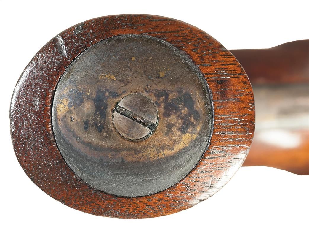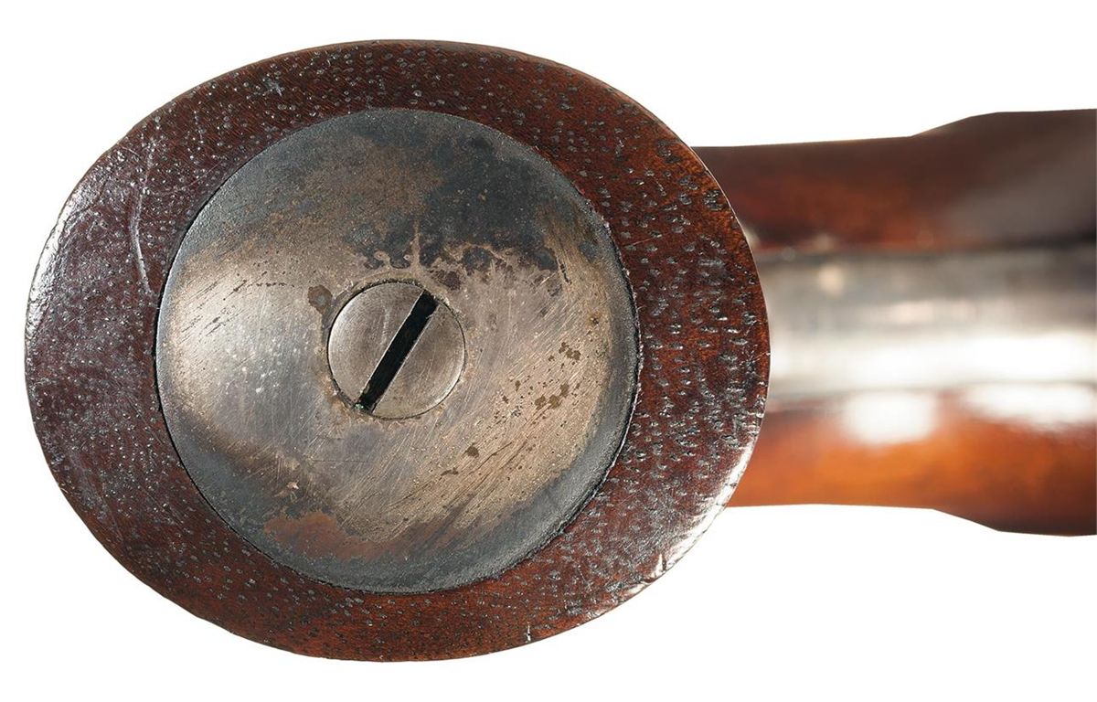 Very fine. The barrel and tang retain 40% original brown finish with a smooth gray patina on the balance. The hammer and lock plate retain traces of original case colors. The brass fittings retain 95% original silver plating. The stock is excellent showing a few minor pressure dents with most of the oil finish remaining and crisp edges.