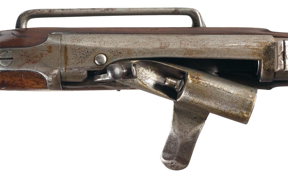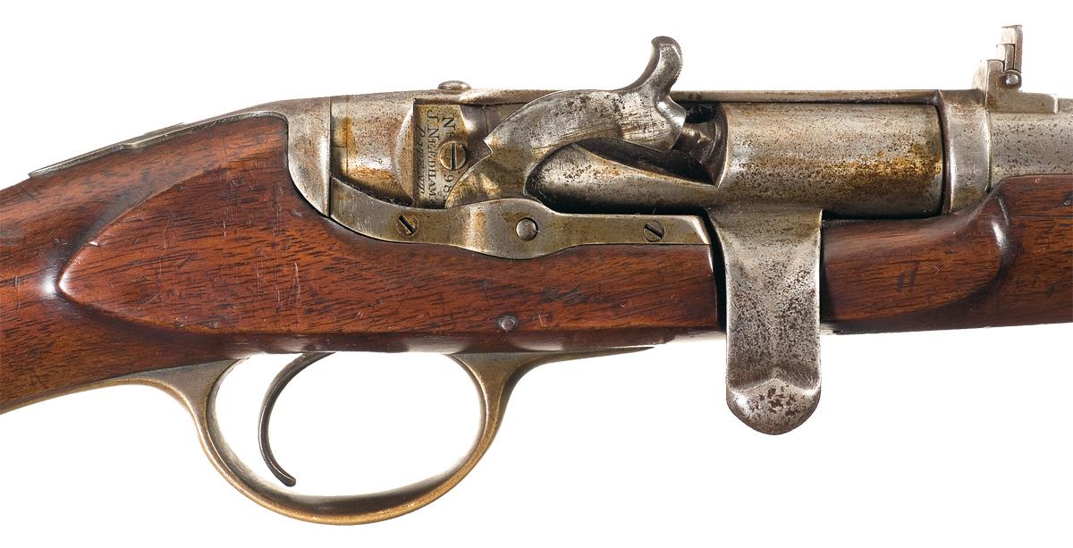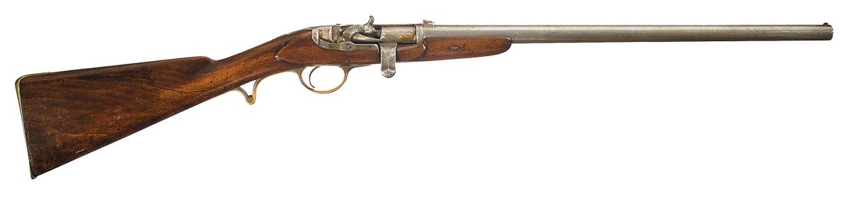 Condition: Very good. The barrel, breechblock and hammer have been lightly cleaned and have a silver-gray patina with scattered light pitting and age discoloration. The brass trigger guard and buttplate have a mellow age patina. The sling ring is missing from the bar. The stock is very fine with moderate handling wear and several minor dents on the left side of the forearm surrounding the barrel wedge. This is a solid example of a prototype British breech loading percussion carbine that writer cannot recall ever having offered at auction!