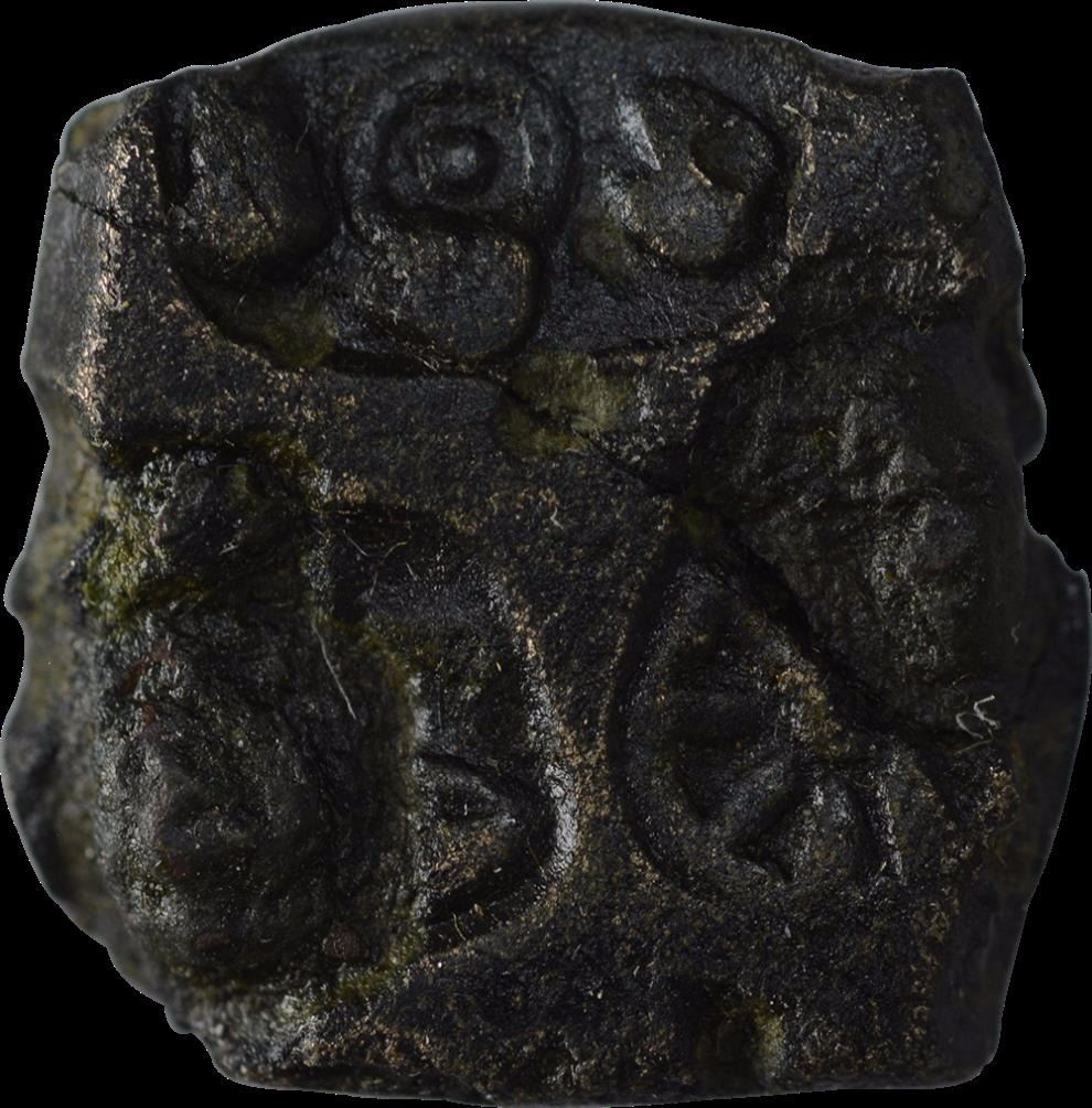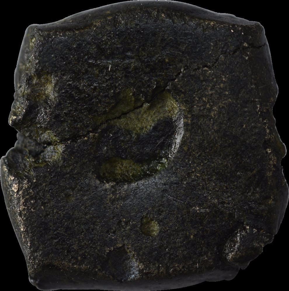 Punch-Marked Coin, Vanga Janapada, Copper Karshapana,Obv:three symbols on the obverse include, a wheel, a six-armed symbol and a boat representing riverine trade in bengal,Rev:conch shell (shank) single punch,3.83g, 14.66x14.40mm,about very fine, Rare.