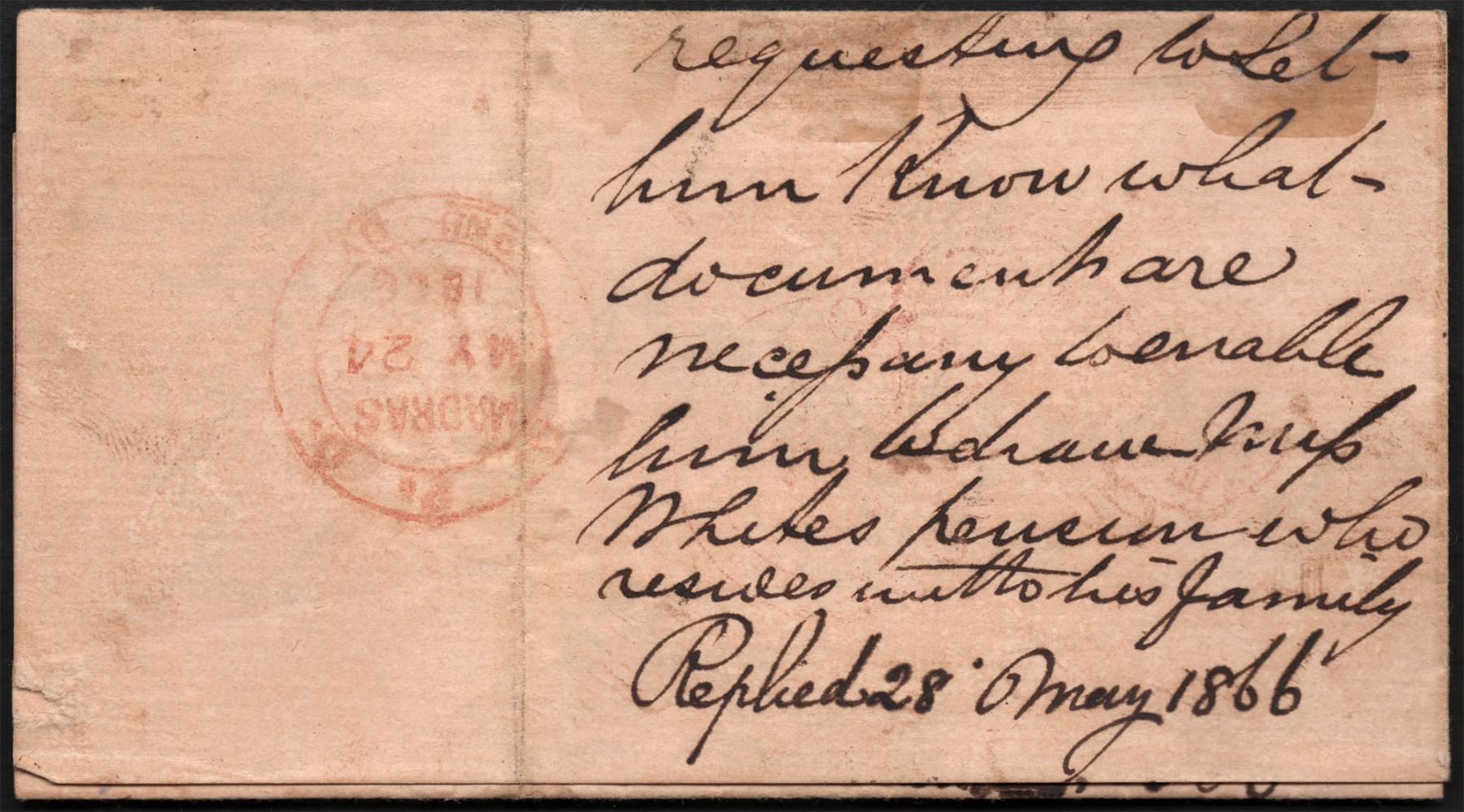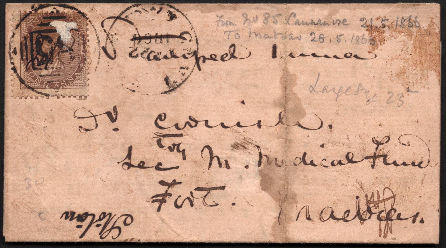 Postal Cover, 1 Anna, 1866, Queen Victoria, letter folded as cover, dispatched from Cannanore to Madras, addressed to “?? | Sec In Medical Fund | Fort | Madras”, Tyoe 9 (ref: Bhargave & Chandak) cancellation with a round dispatch seal in black as “21 | 5 | 1866” on the front, along with black round seal with a diamond and a small square inside having “85” signifying Cannanore, and a round delivery seal in red on the back side as “G. P. O. | MADRAS | MY 24 | 1866 | ??”, also has some collector’s notes in pencil, good condition, Rare.