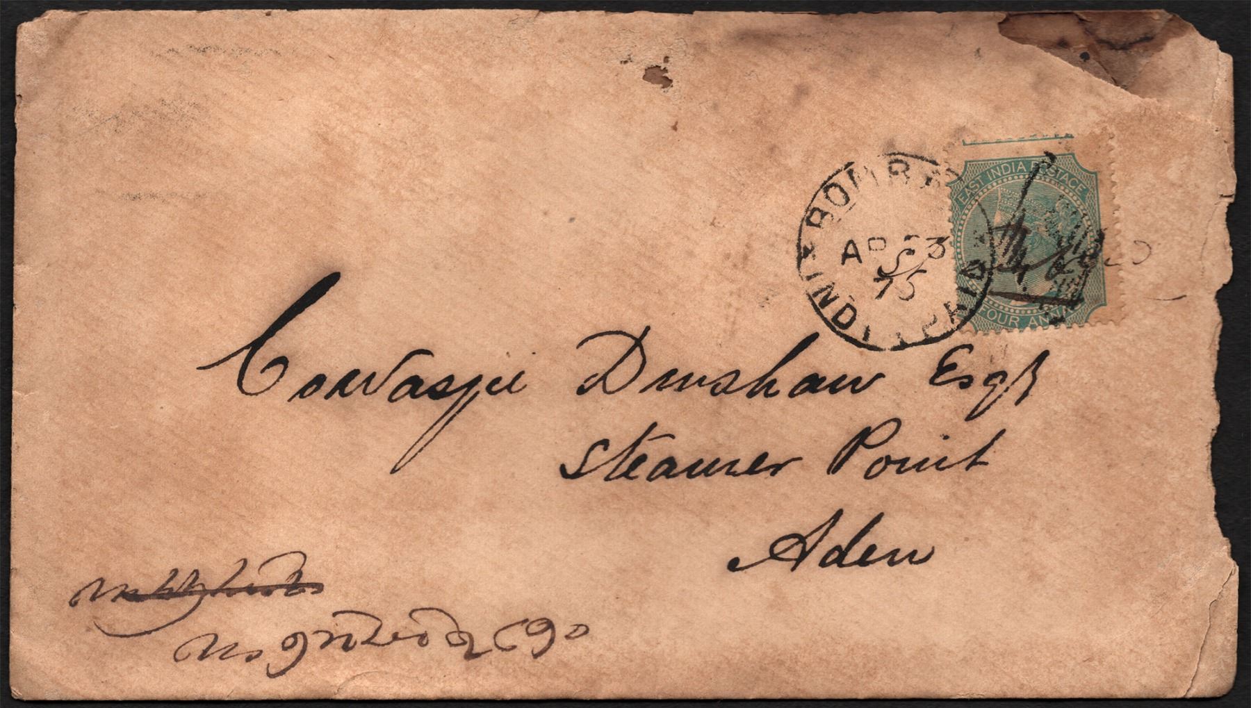 Steamer Cover, 1870, Queen Victoria, 4 Annas, cancelled with a duplex obliterator consisting of concentric round dispatch seal in black as “BOMBAY | AP 13 | 70 | INDIA PAID” on the front along with a parallel lined diamond seal with "1", hand endosed faded text is seen on the cancellation seal and stamp, dispatched from BOMBAY via steamer, addressed to “COWASJEE DINSHAW, ESQ | STEAM POINT,| ADEN”, and round delivery seals on the back which are not readable, there is a “7 May 1870” date marked in Gujarati on the bottom left front side of the cover as “તા: ૭મે૧૮૭૦” which can be the arrival date of the cover, some usual torn, otherwise good condition, Very Rare.