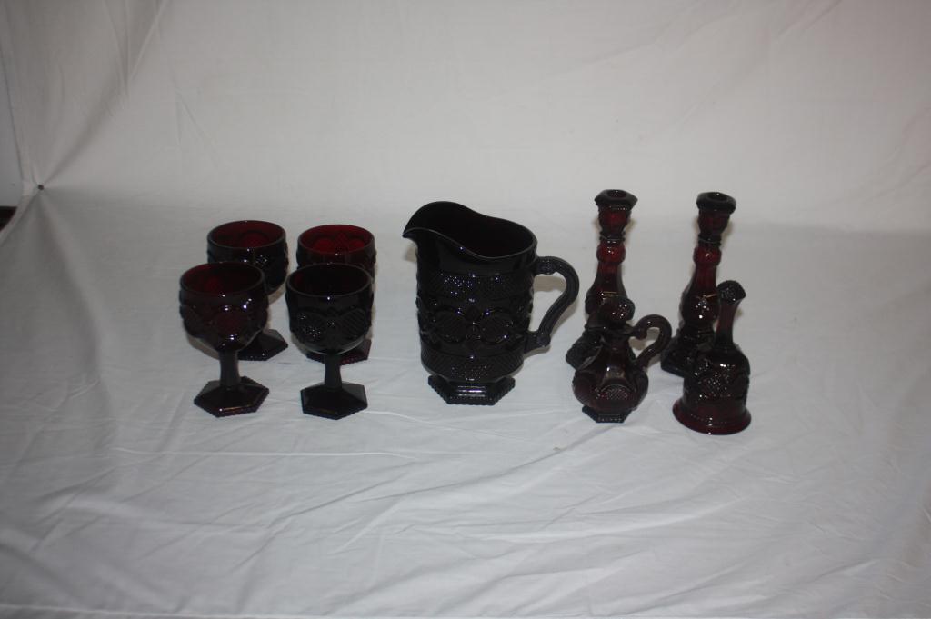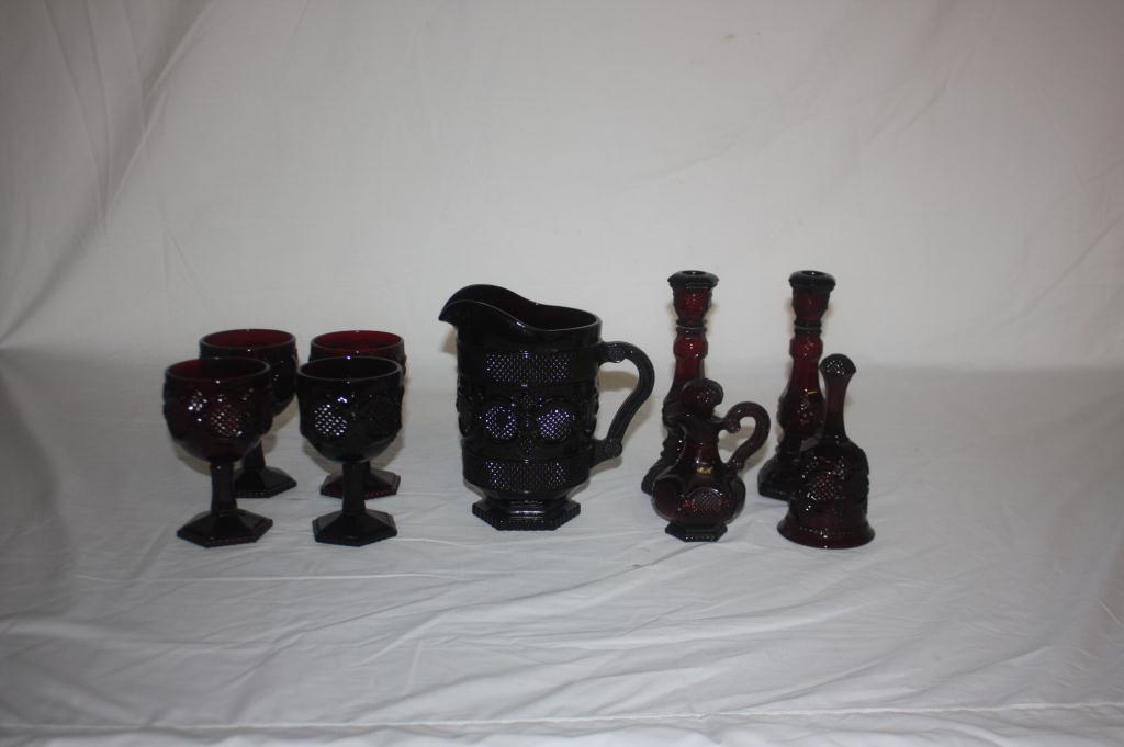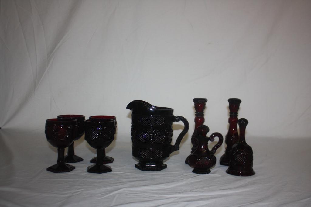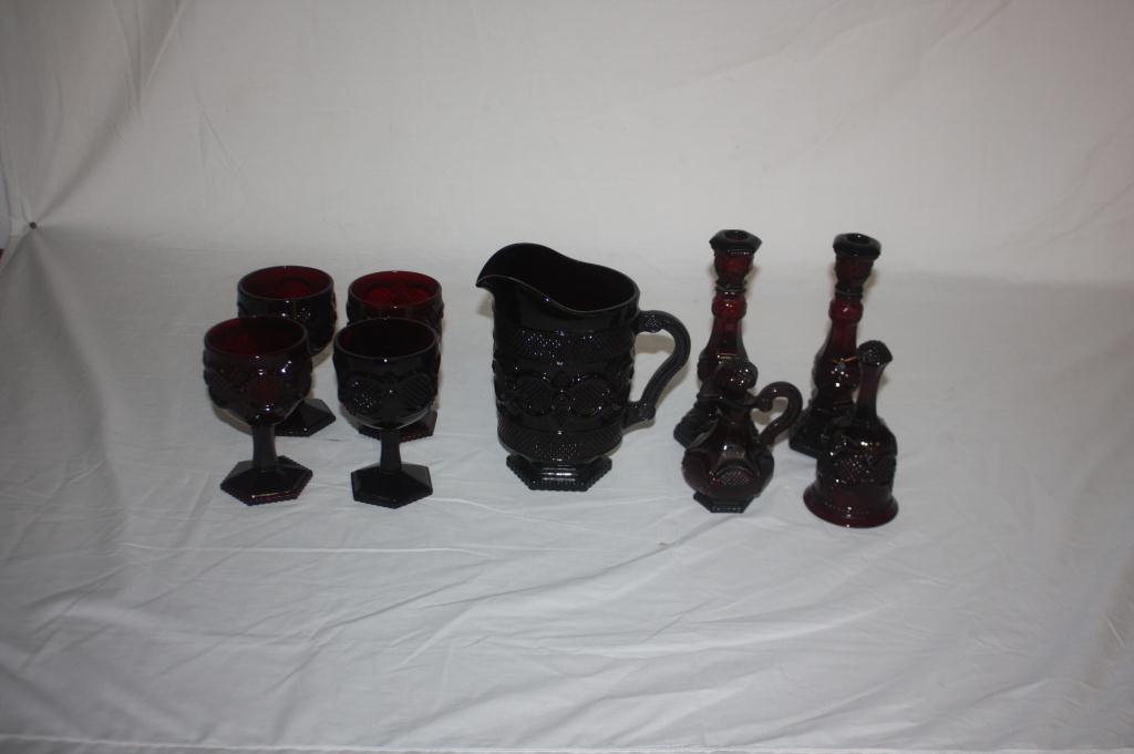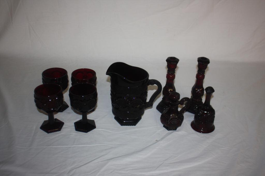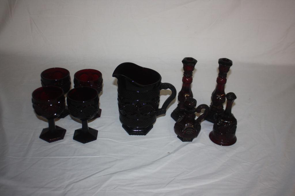 Rare-Red "Avon" Pitcher, glasses & Candlesticks