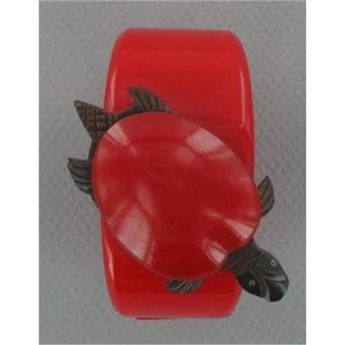 A rare find! Red Bakelite Bracelet with a Bakelite and wood turtle. Hinged. c.1930. I purchased a large bakelite collection and this is the first to be listed. Stay tuned.