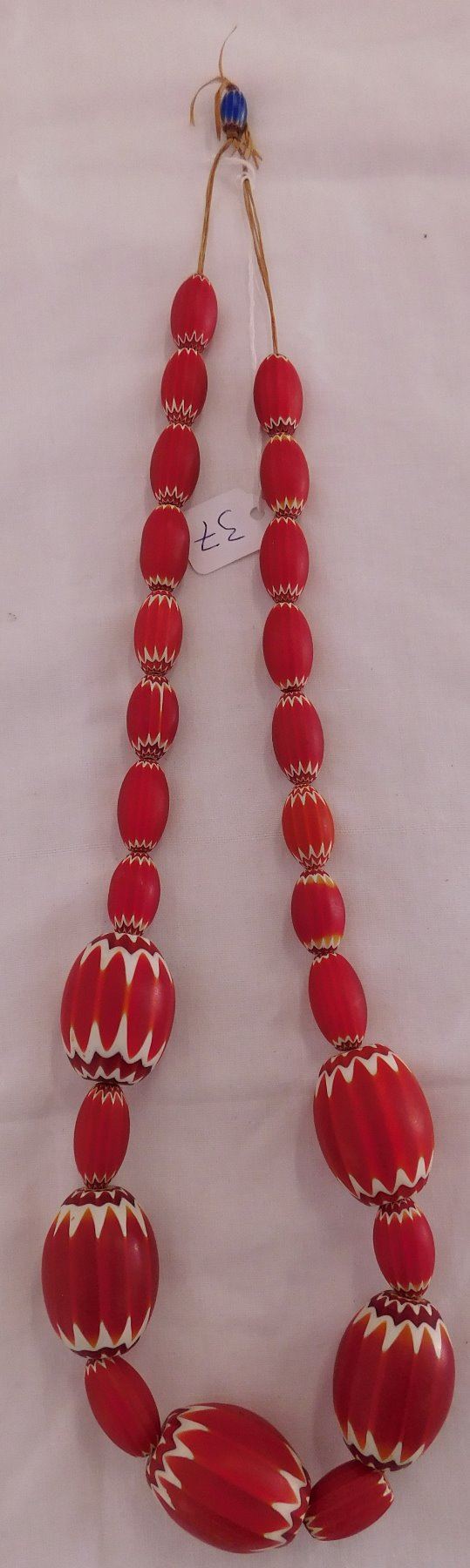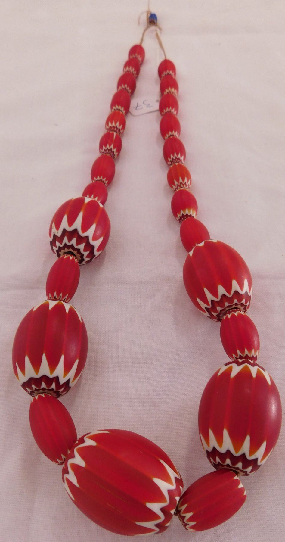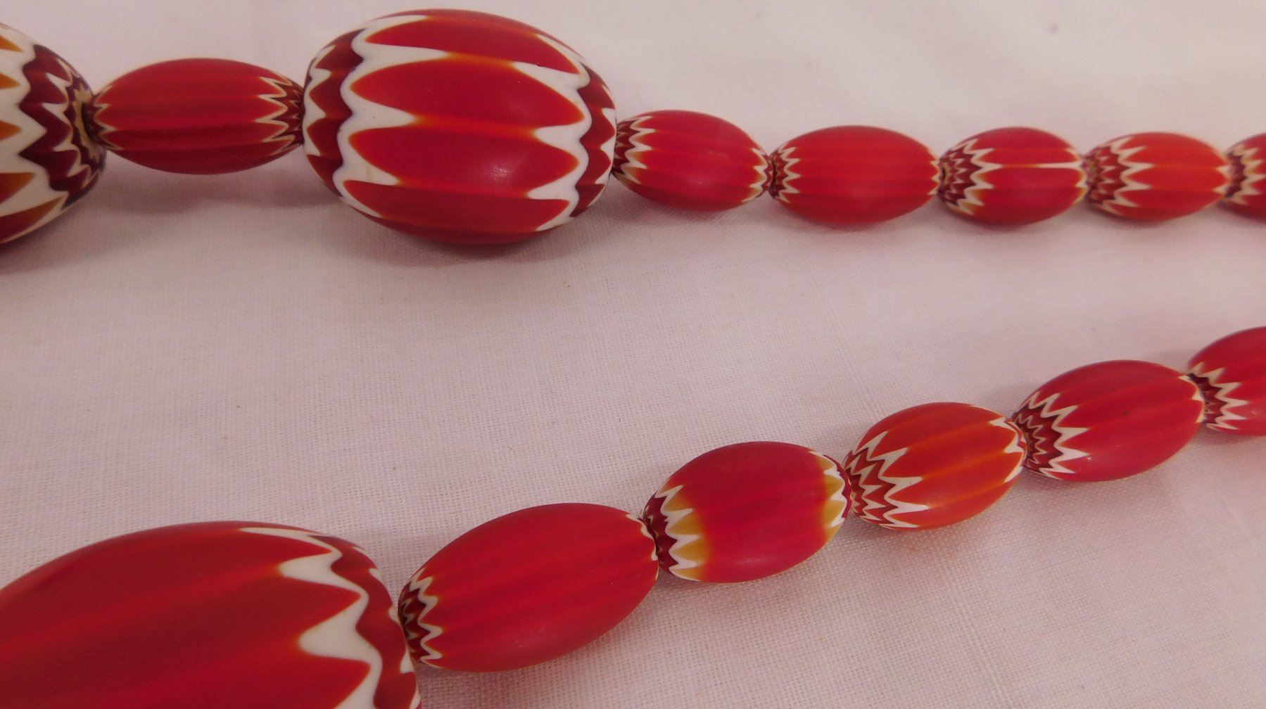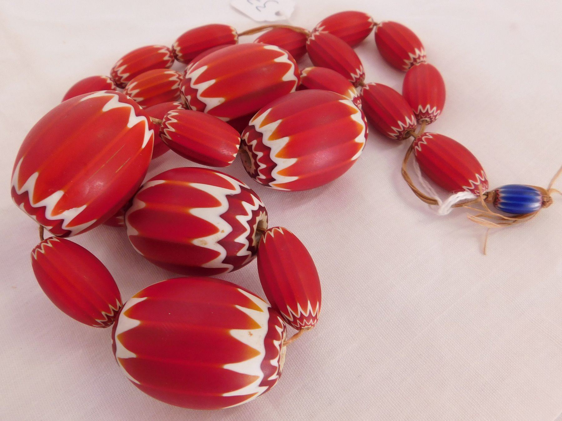 Rare Red Chevron Beads, circa 19th century. Made of glass, the necklace hangs 15" as worn. Italy. 6-layer chevron or star beads. There are 20 beads of 1/2" x 1" size, and 5 of 1" x 1 3/8" size. Includes 1 small blue bead visible from behind the neck when worn. Condition: Good, some wear, see images. Shipping: $18.50 w/insurance and signature.
