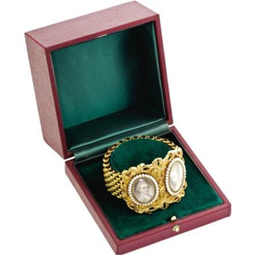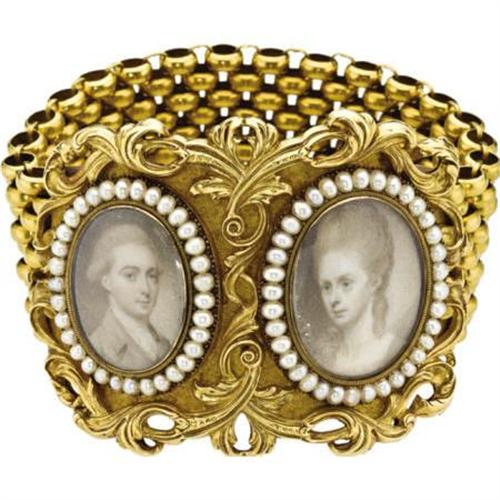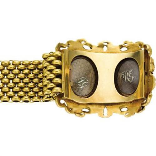 <B>Rare Regency 18 Karat Gold Bracelet Belonging to the Earl and Countess Grosvenor</B></I><BR><I>English, circa 1820</B></I><BR><BR>The front of the cartouche curved outline with entwined raised foliate design in polished gold, applied with a pair of <I>grisailles</B></I> miniatures on copper, said to be of the Grosvenors<B>,</B></I> each within seed pearl frames, the reverse containing plaited locks of hair and respective initials <I>RG</B></I> and <I>TG</B></I> below glass, attached to a wide gold link mesh bracelet-the front- 2 3/4 in; the bracelet-5 1/4 x 1 in. <BR><BR>Having invested during the early 18th century in property in Mayfair, then an area of dubious repute on London's outskirts, the Grosvenors are one of Britain's wealthiest families. In 1874 Queen Victoria promoted Hugh Lupus Grosvenor from Marques to Duke of Westminster, creating the last non-royal duchy in England. As a result, the Duke of Westminster holds the paradoxical distinctions of being both the richest hereditary peer and last in precedence among Great Britain's ducal houses.<BR><BR>Provenance:<BR>Purchased from Sheldon Shapiro, London<BR><BR><b>Shipping:</b> Requires 3rd Party Shipping (<a target="_blank" href="http://www.heritageauctions.com/common/shipping.php">view shipping information</a>)