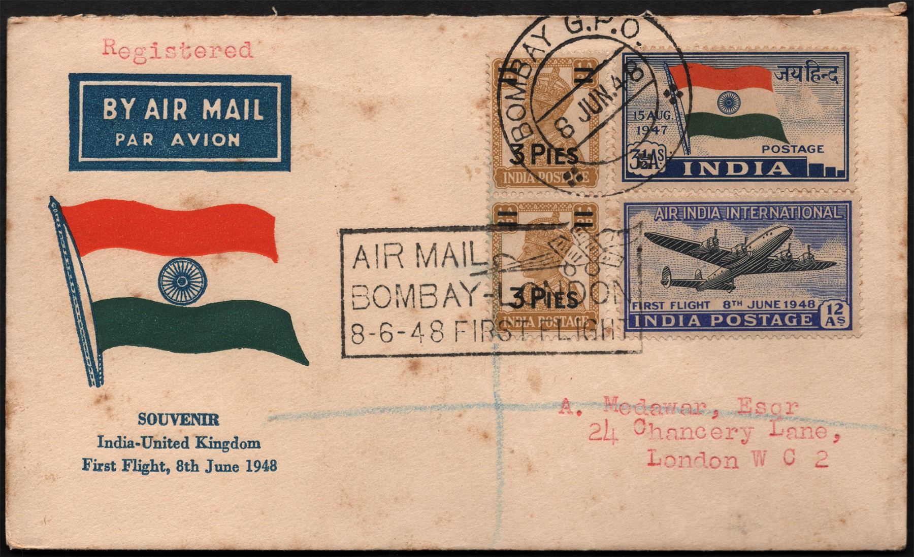 First Flight and Registered Cover, 1948, Tri-colour Indian flag printed, pair of George VI 3 Pies stamp, that is overprinted on 1 Anna 2 Pies stamp, with India’s first issue of stamp valuing 3 ½ Annas & 12 Annas, cancelled with round concentric postmark in black as “BOMBAY G.P.O. | 8 JUN. 48”, along with rectangular first flight pictorial seal with an image of aero plane as “AIR MAIL | BOMBAY – LONDON | 8-6-48 FIRST FLIGHT”, addressed to “A. Medawar, Esqr | 24 Chancery Lane, | London W C 2”, dispatched by “FEDERAL STAMP CO. | 42, CHURCHGATE STREET, | FORT, BOMBAY.”, seal of “Registered” in red on the front cover above the printing “BY AIR MAIL | PAR AVION”, Registered label affixed on the back as “R v 7 92 | BOMBAY G.P.O.”, good condition, Rare.