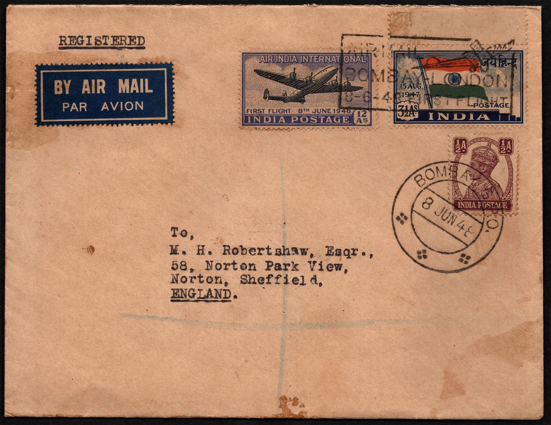 First flight cover, Registered Cover, George VI, 1948, ½ Anna, Republic India’s first issue of stamp valuing 3 ½ Annas & 12 Annas, all affixed on front, cancelled with round concentric postmark in black as “BOMBAY G.P.O. | 8 JUN. 48” along with rectangular first flight pictorial seal as “AIR MAIL | BOMBAY – LONDON | 8-6-48 FIRST FLIGHT”, depicting that the cover has travelled in the first ever international flight in Indian history, addressed to “M. H. Robertshaw, Esqr., | 58, Norten Park View, | Norton, Sheffield, | England.”, dispatched by “J. H. Pestonjamaap, | C/O The Central Bank of India Ltd, | Fort, Bombay, India.”, “Registered” marked on the front of the cover above the printing “BY AIR MAIL | PAR AVION”, Registration label affixed on the back as “R V 255 | BOMBAY G.P.O.”, good condition, Rare.