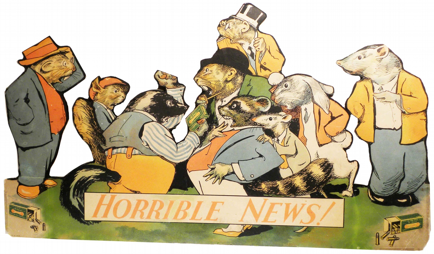 Remington Arms Company. Kleanbore Ammunition Die Cut Cardboard Easel Back Window Display. Missing side stabilizers and badgers hand. Slight fading, wrinkles and minor restoration bottom right.
