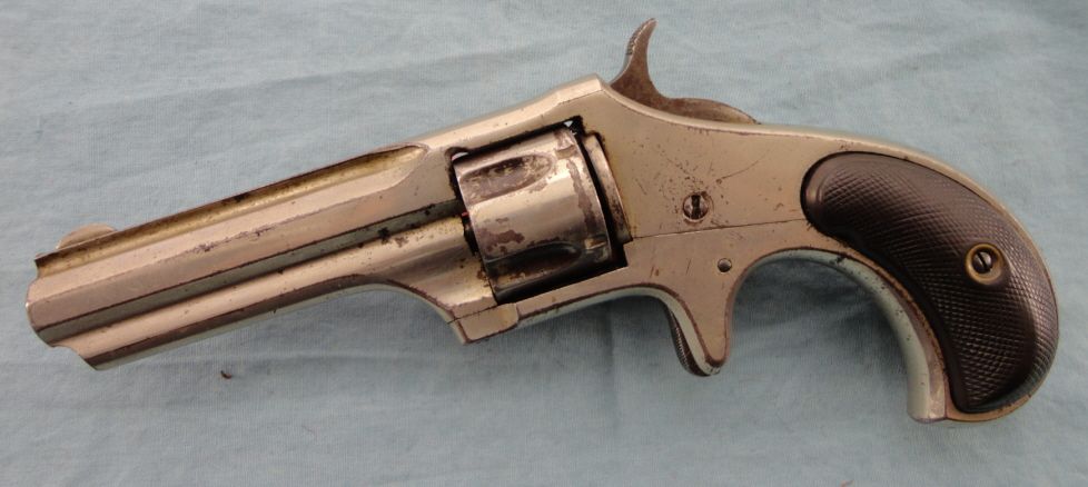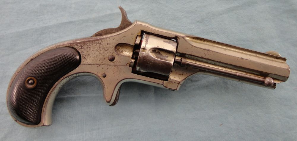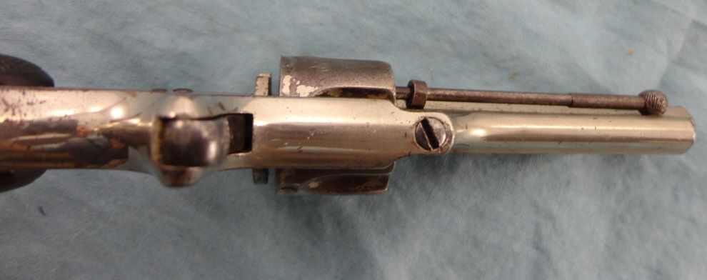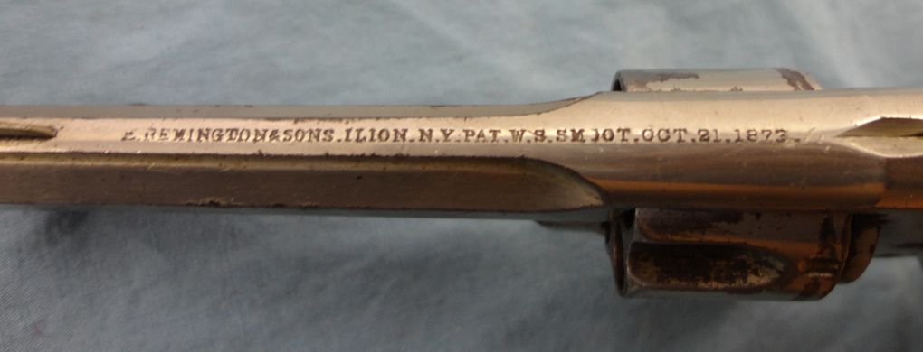 #NSN: Antique. 30 cal. 2.75" oct. bbl. 5 shot cylinder Nickel plated w/hard rubber grips. Clear bbl. markings. Functions fine. Some flaking on sharp edges & parts of cylinder. Good overall condition for an early Remington revolver. Mfg. in 1870's & 1880's.
