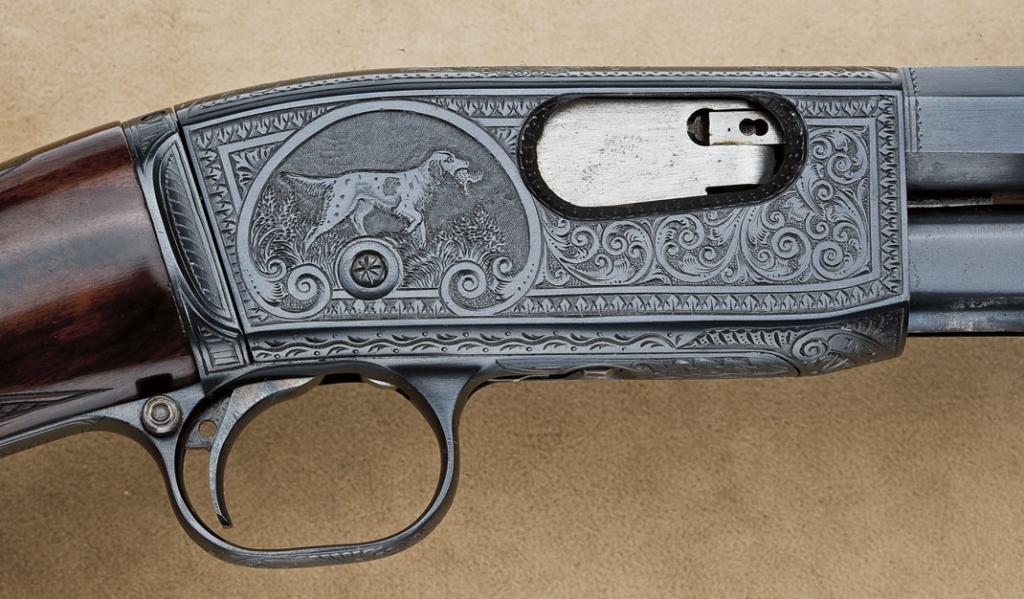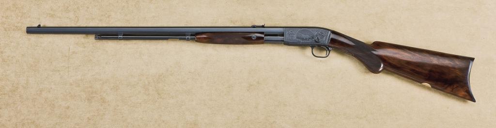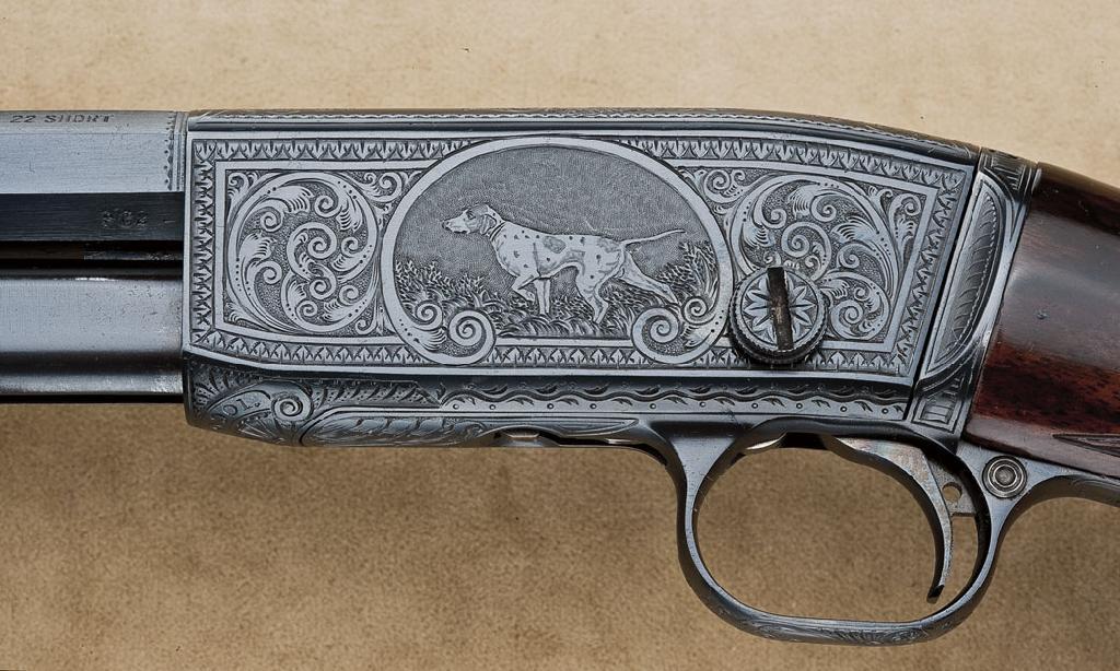 Rare Remington model 12C .22 short only pump-action rifle factory deluxe engraved, F grade, deluxe checkered wood stocks, octagon barrel, blue finish, takedown frame, serial number “24901”. The rifle remains in excellent to near new original condition with 98-99% plus original blue finish, some slight losses at operating areas and edges, but very near mint overall with original factory colors on trigger and small interior parts. The stocks are also fine to excellent and show a deluxe burl wood grain, just some minor handling and storage, and are very near mint also. The bore is excellent, the muzzle shows its original bright finish, and the rifle has seen very little to almost no use. The left side of the receiver shows a fine portrait of hunting dog pointing, the right side of the receiver shows hunting dog retrieving bird, the balance shows very well accomplished scroll engraving. From a premier North West collection whose owner considered it the best engraved he could find in this model. There is a gold plated brass plaque inlayed into the belly of the buttstock, which may have had an inscription removed from it. Est.: $10,000-$18,000