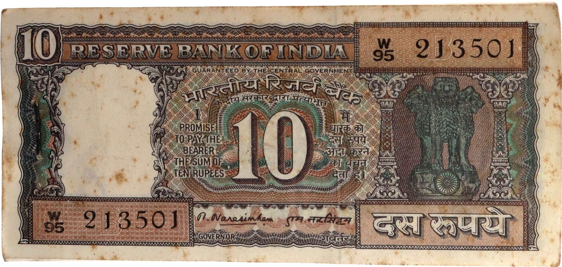 Republic India, 1977, 10 Rupees Bundle (100 Notes), Signed by M. Narasimham, B Inset, W Prefix, S. No. W95 213501 to 213600, (KJ & RR # 6.4.8.3A/RM & AM # R 4.18), gem quality, stains, rust, AU-UNC, Rare.