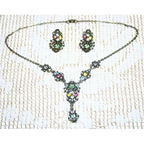 Rice Weiner launched two new lines of Jewelry in the late 1940s, one was named Jeray. This beautiful and unusual soft pastel vintage Rhinestone Lavaliere Necklace and Earrings set was created in the 1940s and signed Jeray. The Necklace is 15 inches long with a 2 inch long by 3 inch wide center drop set with a sparkling center Emerald Cut Peridot colored Rhinestone surrounded by white glass Seed beads, Hot Pink, Yellow, Baby Blue and Lavender colored Chaton Rhinestones, securing with a fold-over clasp. The matching Earrings repeat the same motif as the Necklace, measuring 1 inch long by 3/4 inch wide, securing to the ear with a screw-back closure. Gold plated metals with Antique washed finish and signed Jeray!