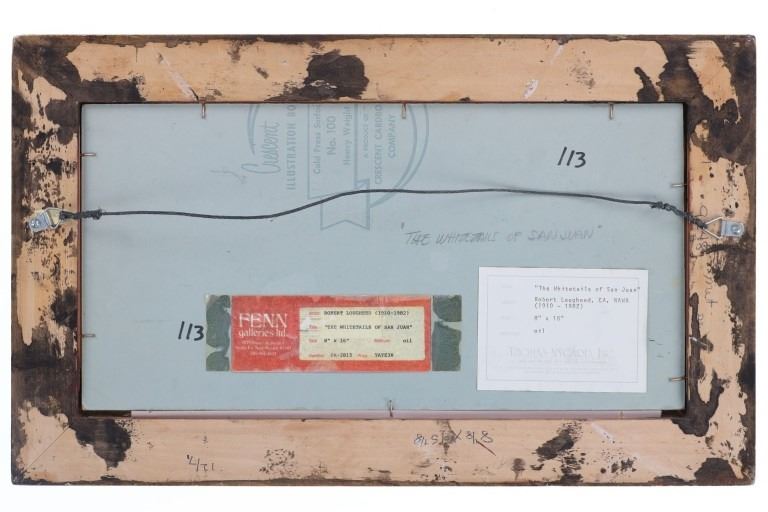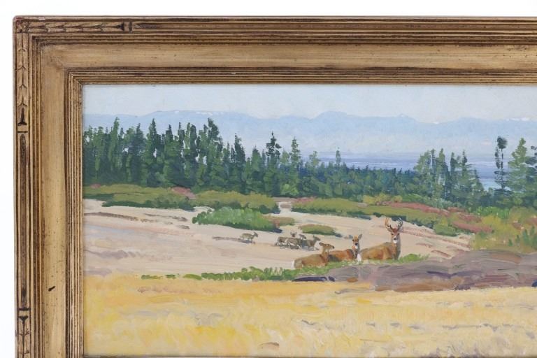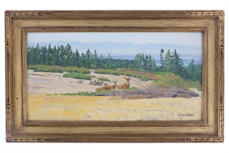 For your consideration is a Rare Signed Original Robert Lougheed "The Whitetails of San Juan", Oil on Board, circa mid to late 20th century. From ex-Fenn Galleries collection Santa Fe, New Mexico; from ex-Thomas Nygard collection Bozeman, Montana; from ex-private collection. This oil on board shows a deer buck and his harem, grazing in a meadow in the foreground. In the background are the Vancouver Island mountain ranges seen across the Strait of San Juan de Fuca. Robert Lougheed was a Canada-born American artist who has specialized in images of the American West. He became an illustrator for over 30 years and for the Toronto Star, and his work appeared in magazines such as National Geographic and Reader's Digest. Lougheed's work as a commercial artist included the Mobil Oil logo of the red flying horse. He explored the American West, particularly the old Bell Ranch in New Mexico, and many of his paintings were inspired by the scenery and animals of the region. He won multiple awards at both the National Academy of Western Art and the Cowboy Artists of America. Some of his work is in the Cowboy Hall of Fame in Oklahoma City, Oklahoma. San Juan Island is the second-largest and most populous of the San Juan Islands in northwestern Washington state. San Juan Island is renowned for its diverse wildlife, especially marine life like orcas (killer whales), seals, and sea lions. On land, visitors may observe black-tailed deer, raccoons, mink, and river otters, with occasional sightings of mountain lions and bears. Black-tailed deer are common an frequently be seen grazing in meadows. This oil on board is in very well preserved condition, mounted in a gold gilt wood frame. Slight scuffing of frame noted. Visible art measures 7.875"W x 15.5"L, frame is 11.875"W x 19.5"L x 1"D. Combined weight is 1lb, 8oz.