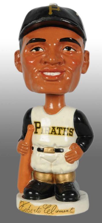 Japanese. 1960s. Depicts Roberto Clemente in Pirates uniform on white round base. Marked "1962 Japan" on bottom of base. Scarcest of all the player nodders. All original condition with one piece missing on right side of head, underneath of ear, two one-inch cracks on back of head, one small chip on hat and brim and cracking to back of base. Condition (Very Good). Size 6" T.