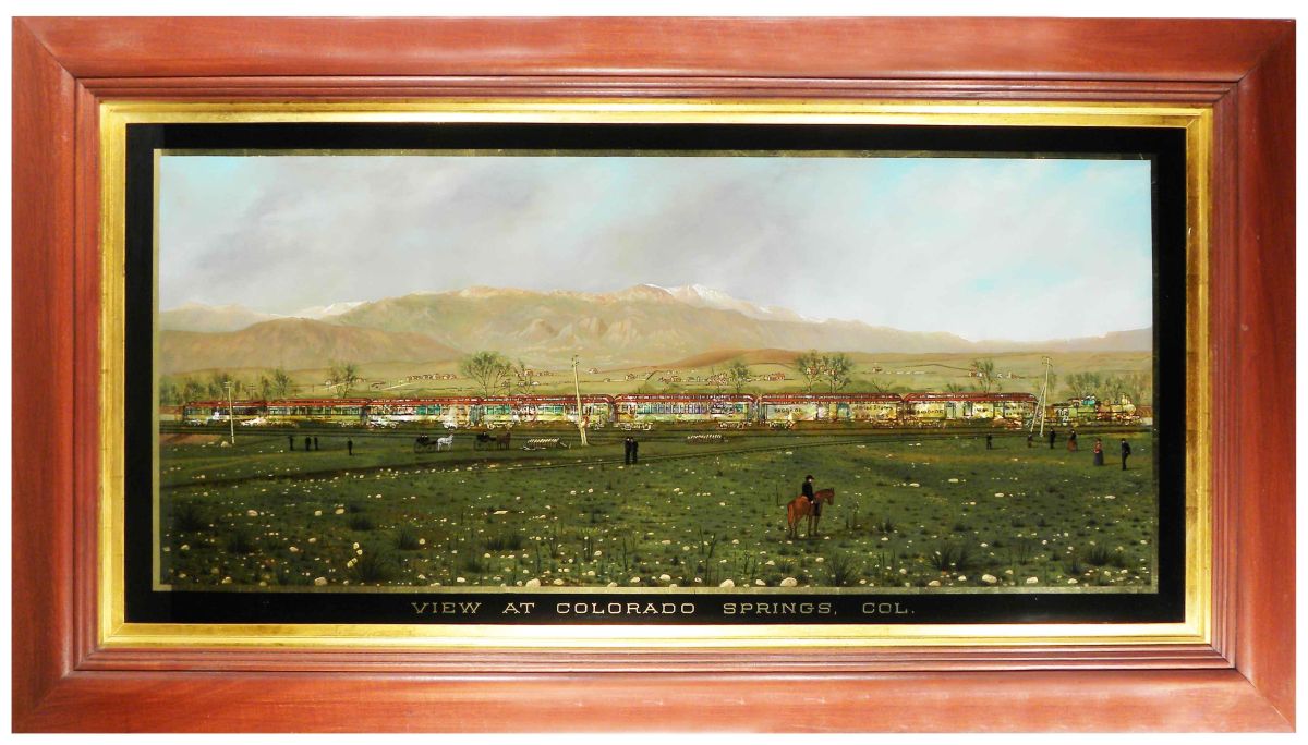 Rare Rock Island Rail Road Reverse Glass Sign with Mother of Pearl inlay train. Made by the Western Sandblasting Company, Chicago, IL. in 1912. View at Colorado Springs, CO. Original frame, excellent condition. 50 X 28 inches overall.