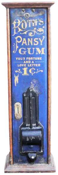 Rare Roth's Pansy Coin-Op Gum Machine. Pressed Steel, Cast Frame and Wood Base. 1 cent gets your fortune and a love letter. Some paint loss otherwise good original condition. 6 1/4 X 20 X 5 inches