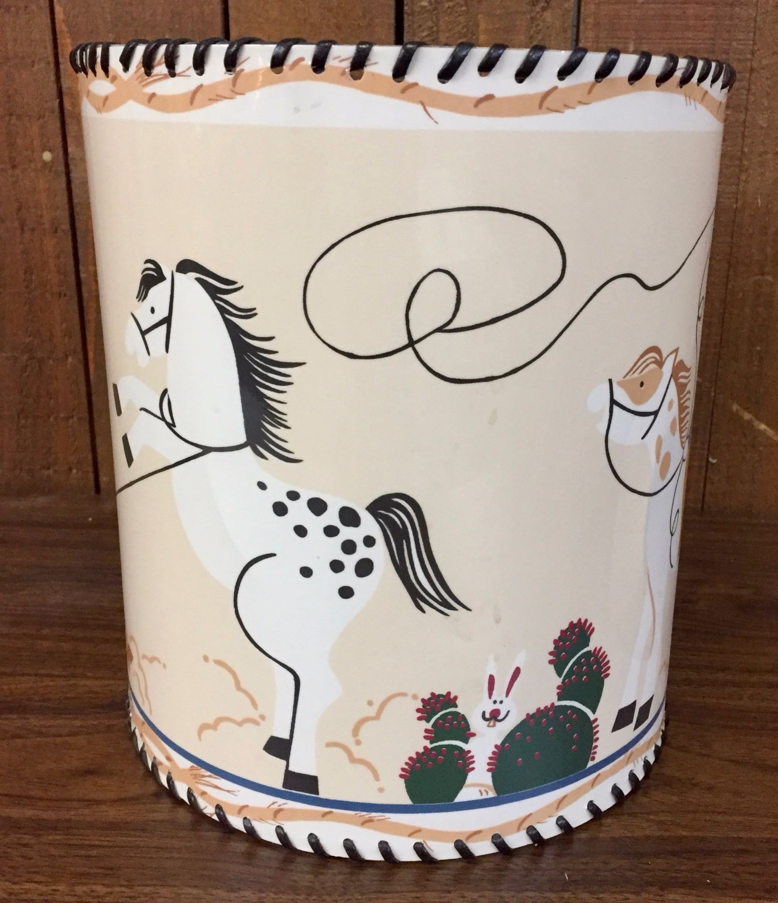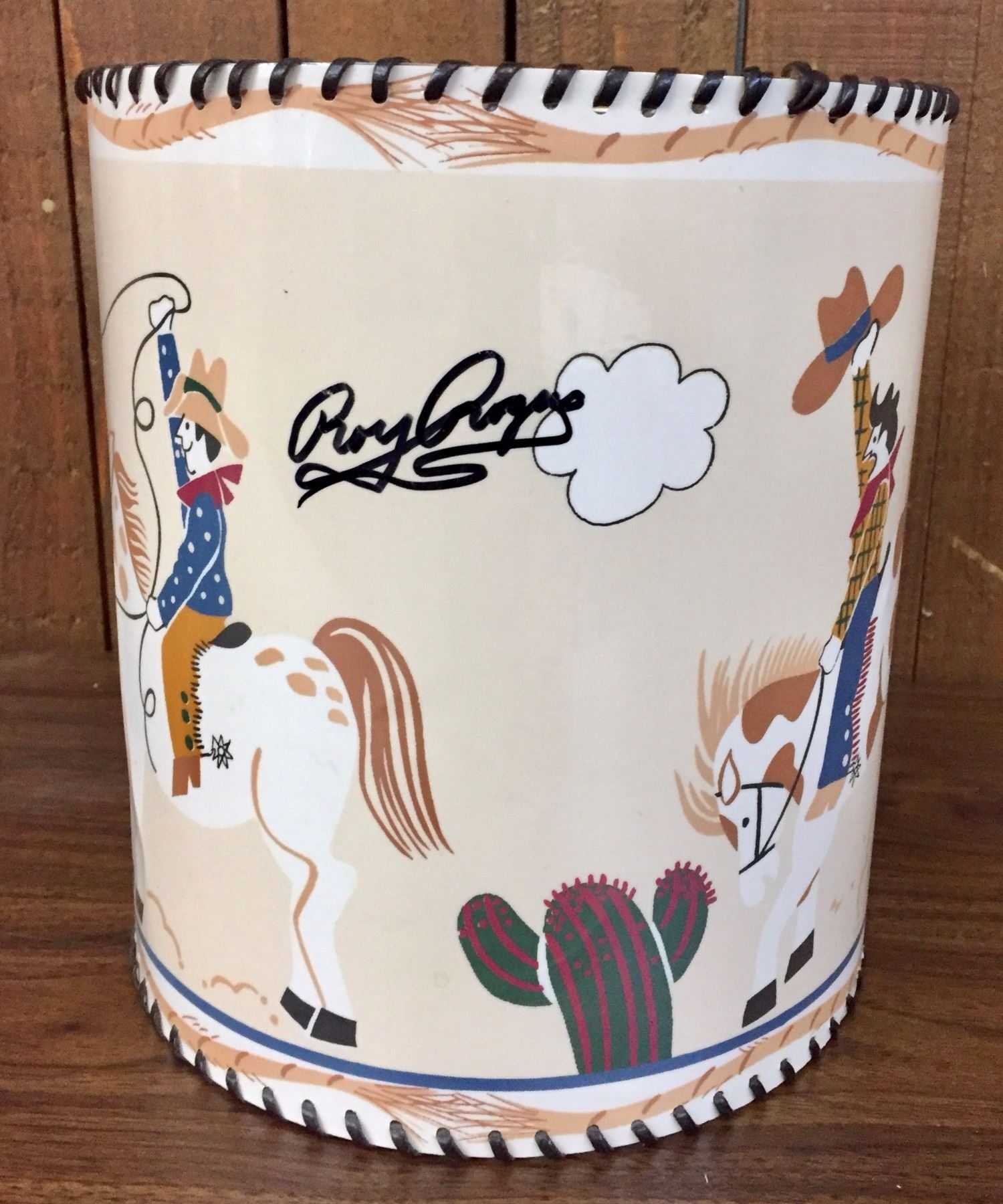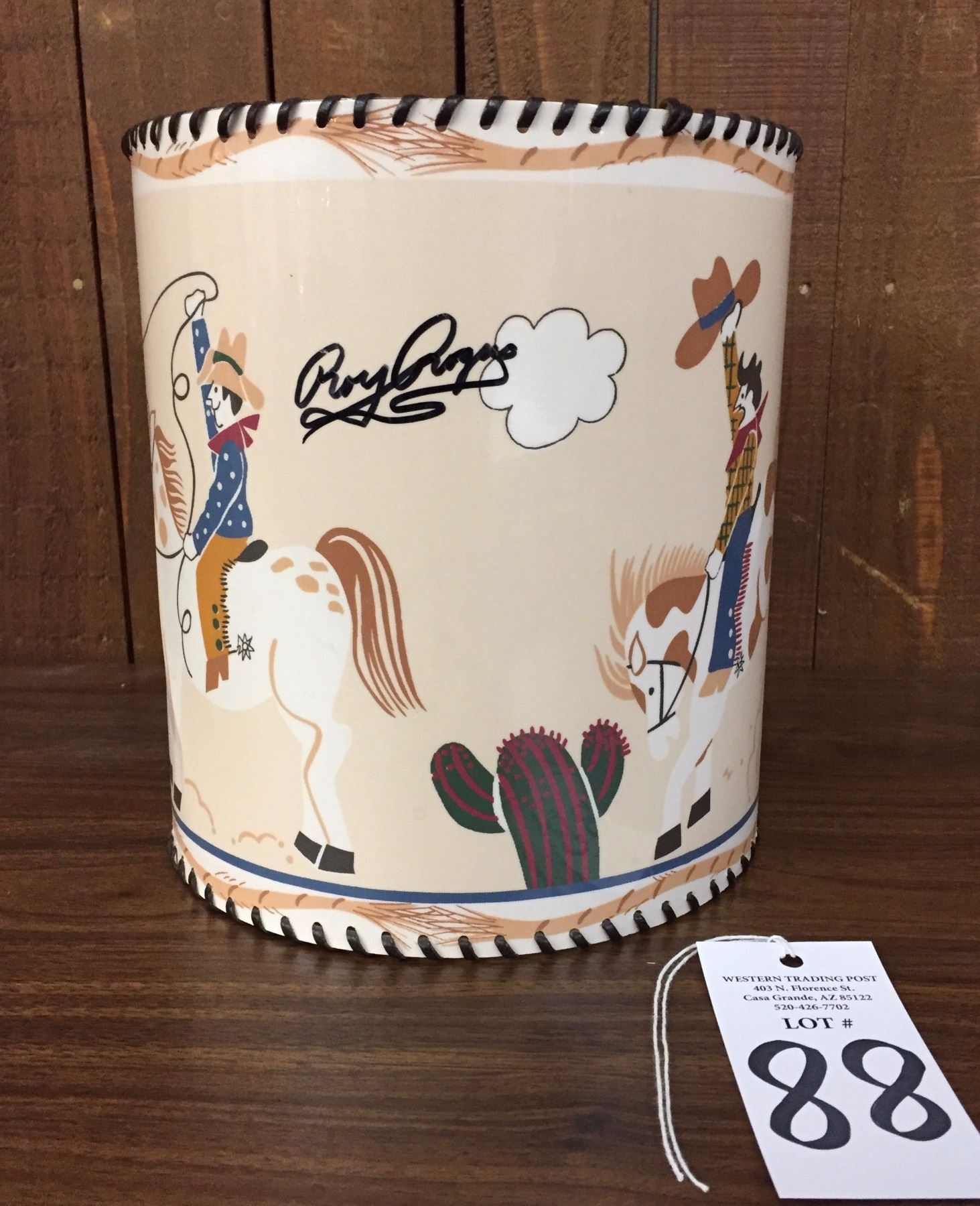 Description: Very nice, whimsical lampshade, signed by Roy Rogers. Live signature collected by a fan at an event in California during the 1980s. Maker: Unknown. Approx. Age: Vintage. Size: 8-1/4” round, 9-1/8” tall. Condition: Good for its age, normal wear expected. Please look closely at the pictures - they are an important part of our description. Shipping: There will be a $10 handling / packaging fee for shipping this lot. The actual cost of postage will be added on top of that.