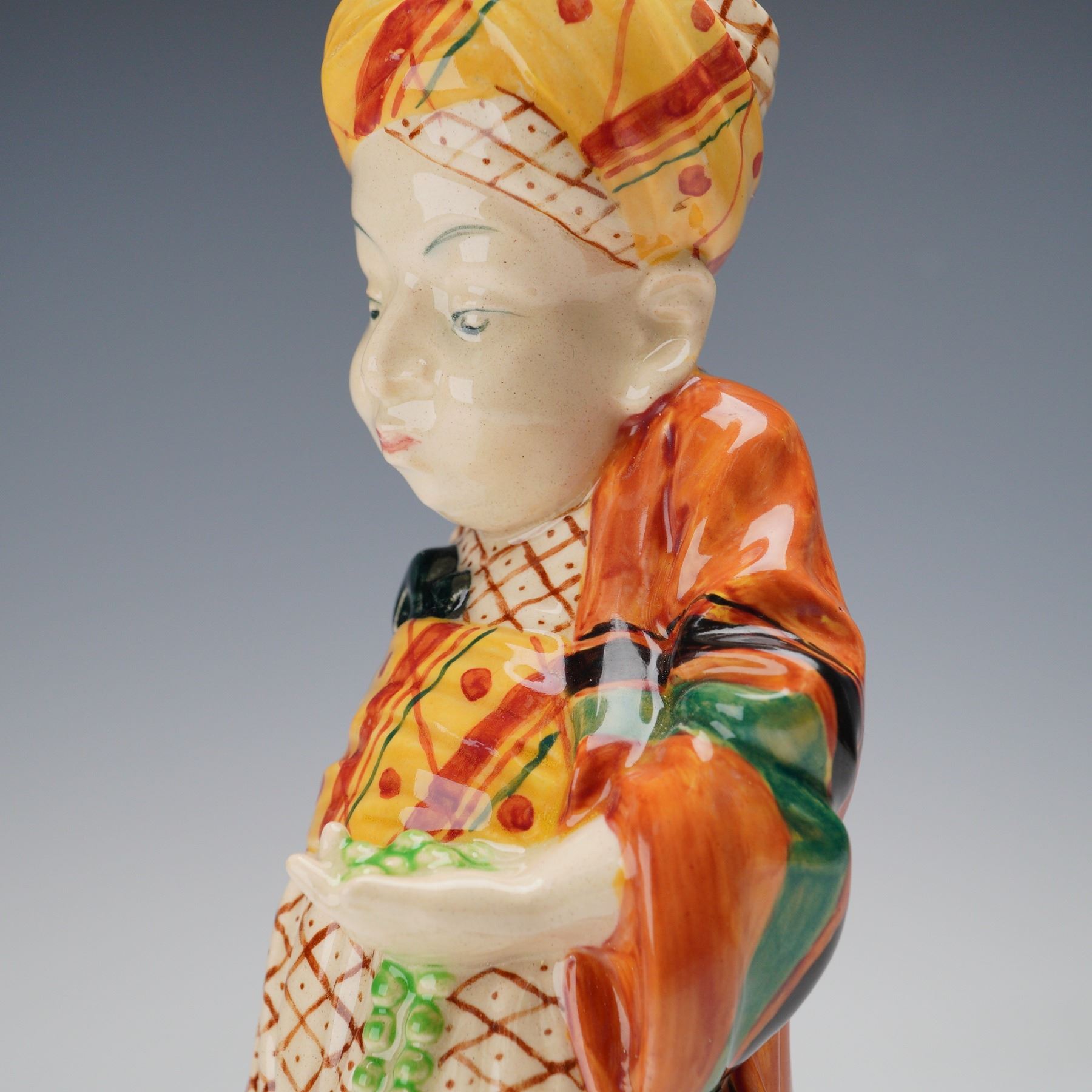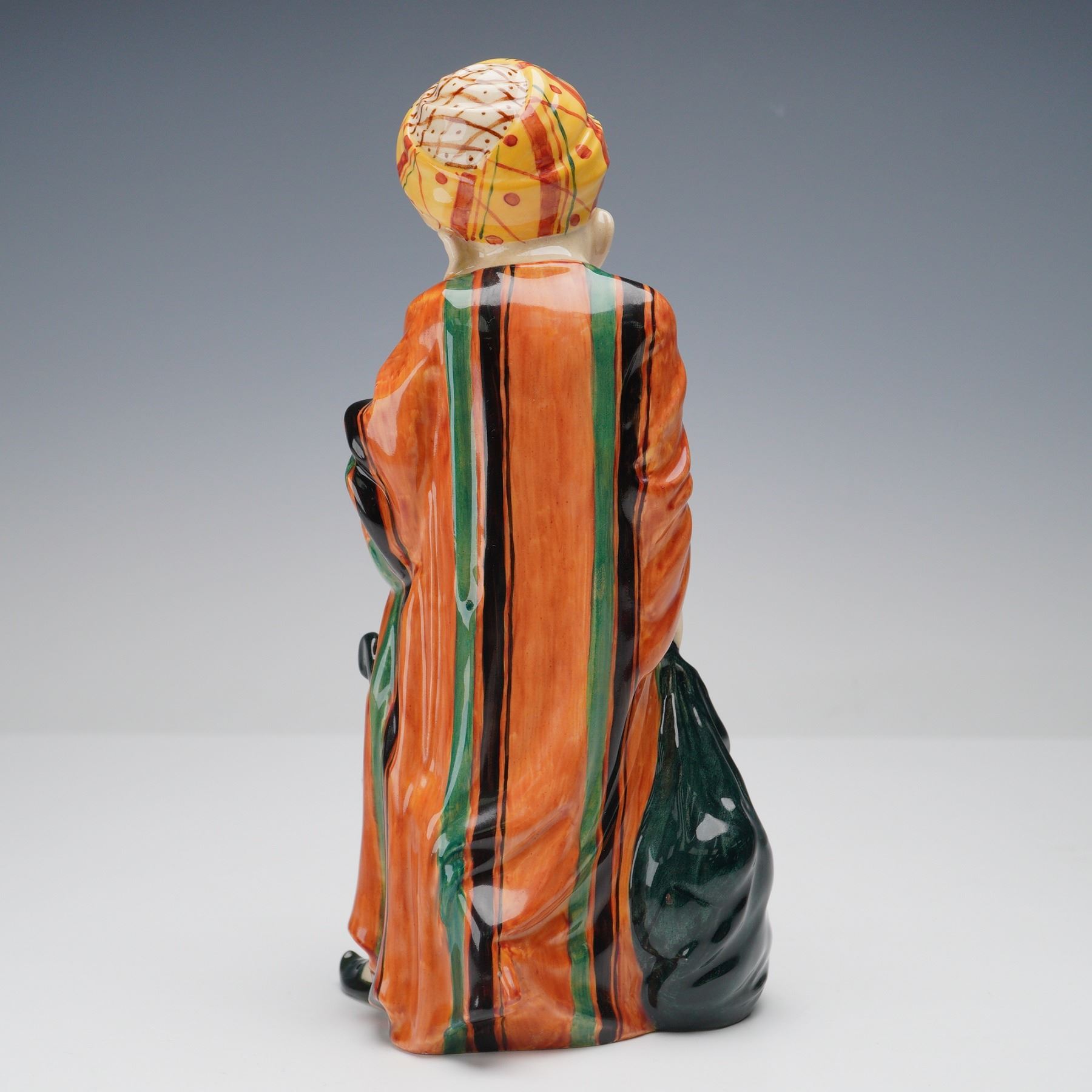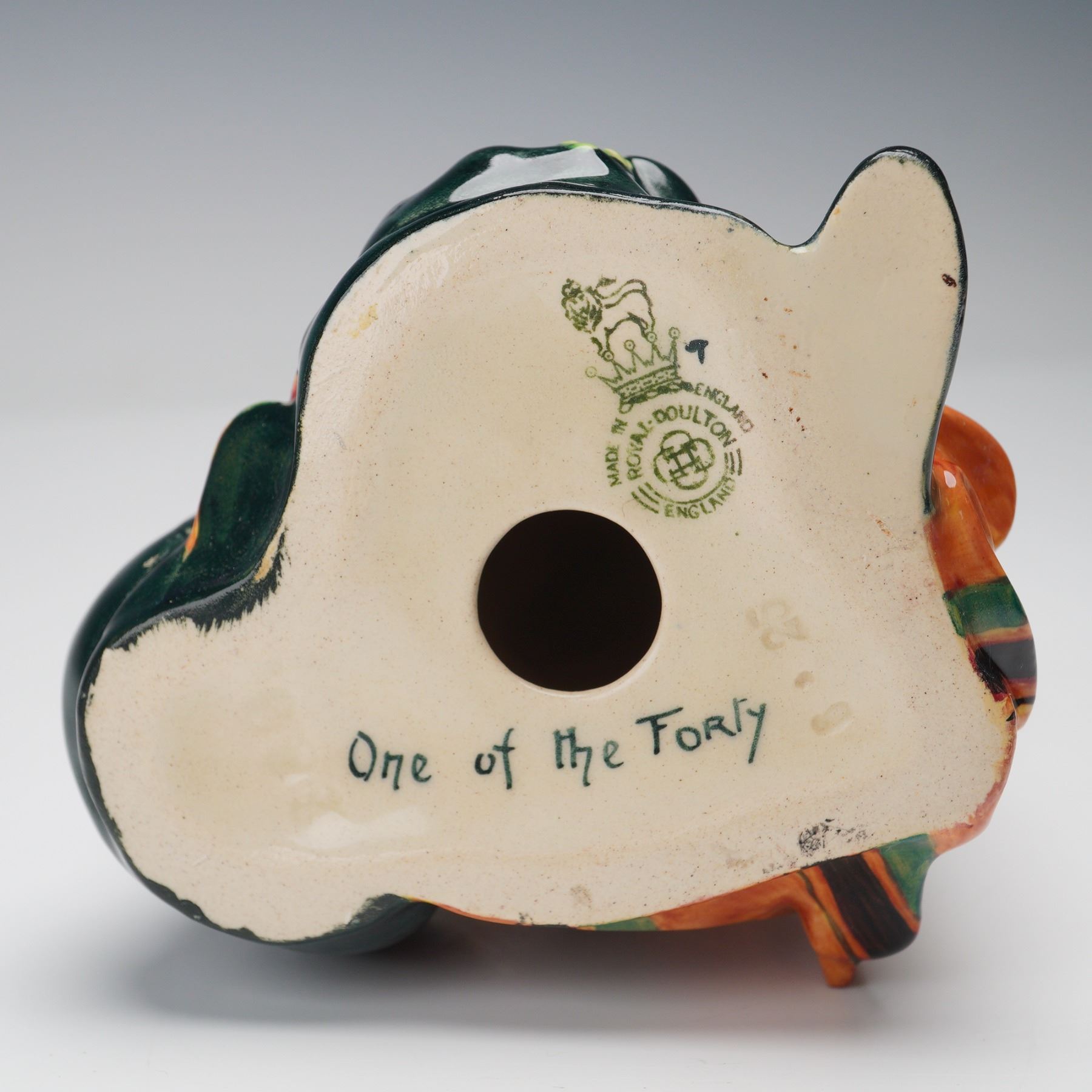 Royal Doulton figurine titled One of the Forty, first version, showing a figure wearing a patterned turban and robe while holding strings of green beads. This is a colorway example featuring an orange cloak with green and black stripes. Marked on the underside with the Royal Doulton backstamp and hand-painted title. An early example from Doulton's production of Middle Eastern-themed figures.