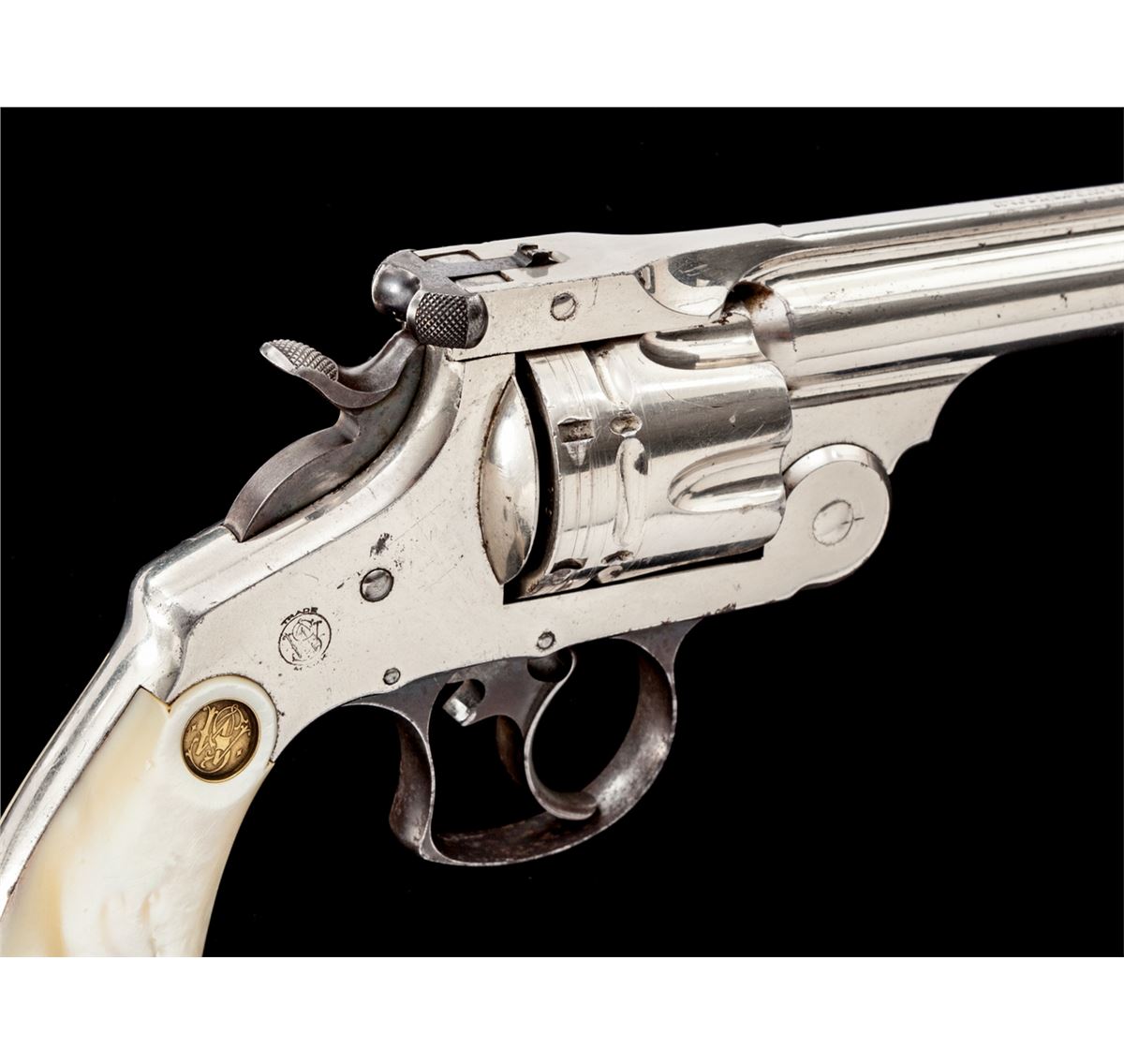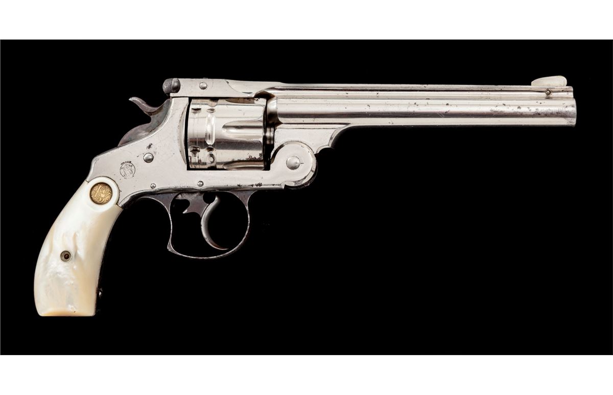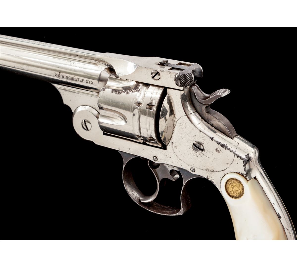 Rare Smith & Wesson New Model No. 3 Double Action Revolver, #216, .38 Winchester Ctg. (.38-40), 6-1/2'' barrel, nickel finish, factory pearl grips with S&W medallions. One of just 276 mfg'd between 1900-1910. This revolver was shipped to Hibbard, Spencer & Bartlett, Chicago, IL, on May 29, 1907, with all features verified by factory letter. Condition is very good to near fine retaining approx. 92% original factory nickel with most of the losses to high edges of cylinder, muzzle, and just above grips, with very light spotting overall. Later added nickel silver front sight could be improved upon somewhat. Grips remain in excellent condition with no losses or cracks. Action is good and tight, bore is mirror bright. Revolver is mechanically excellent. Est.: $2,000-$4,000. (C&R)