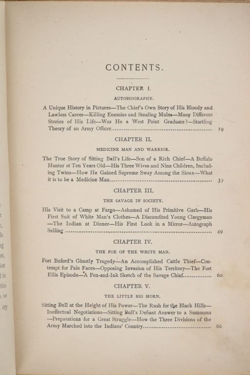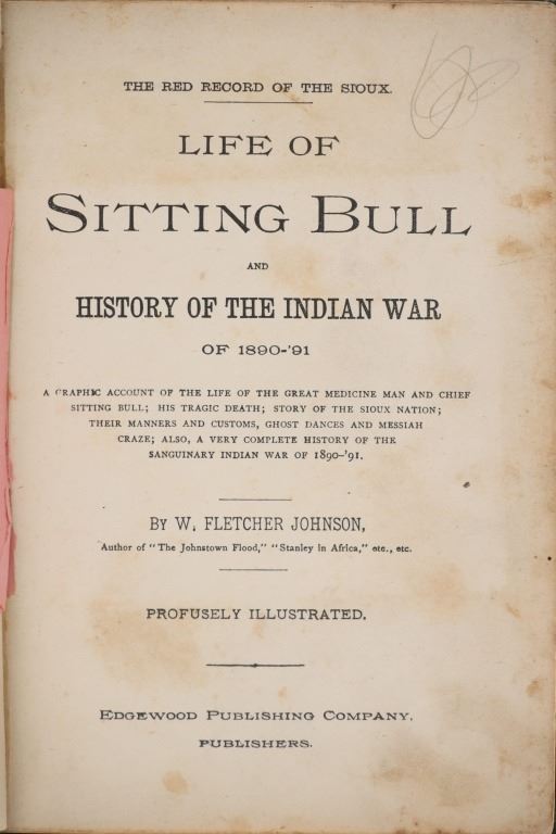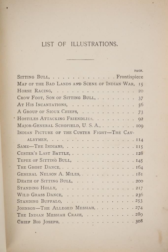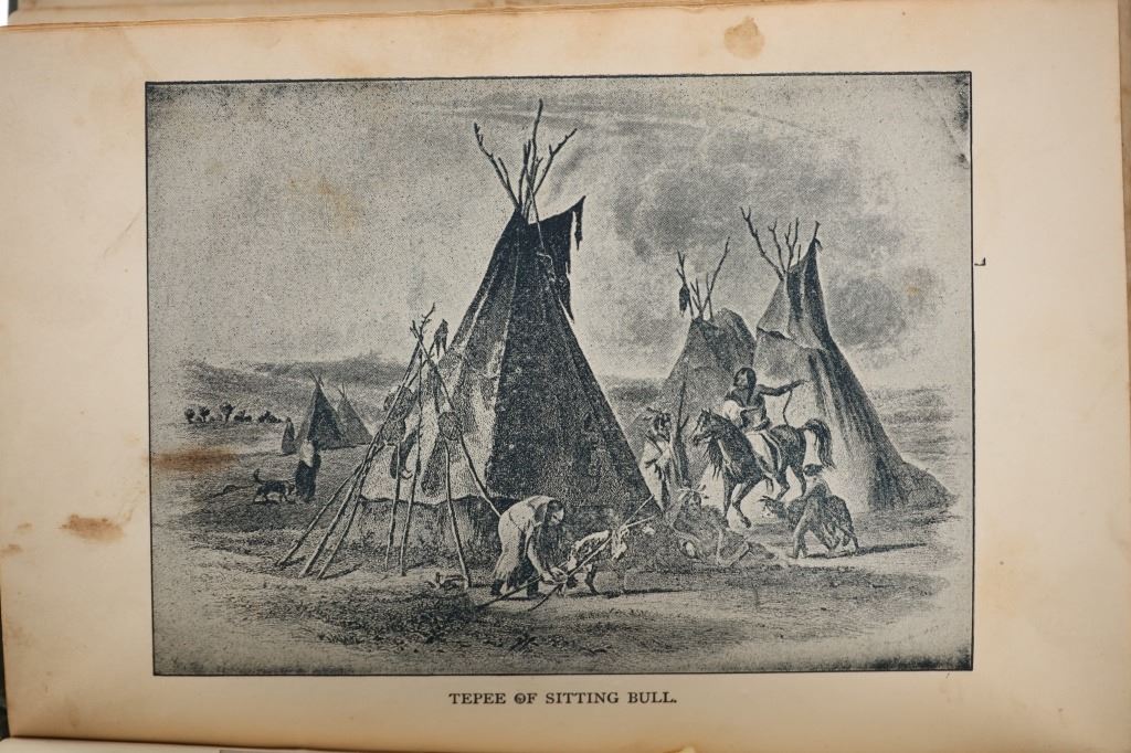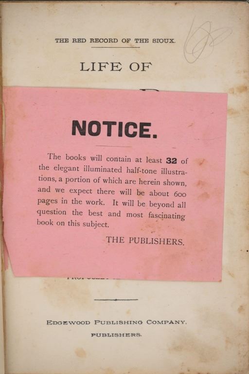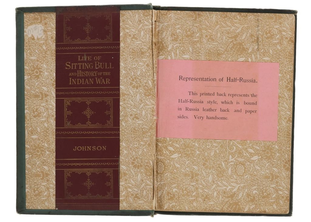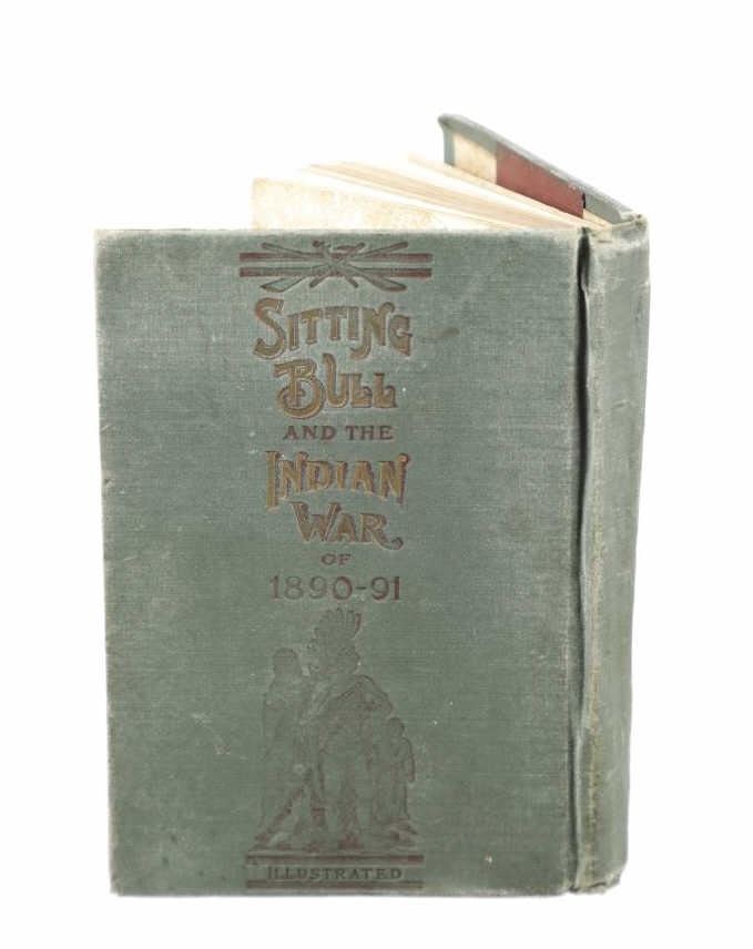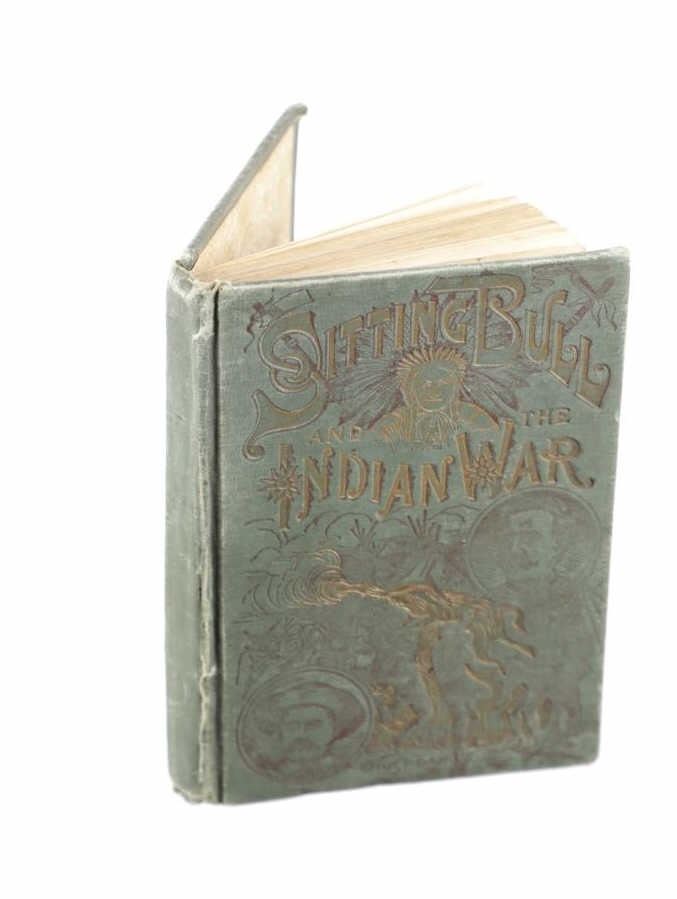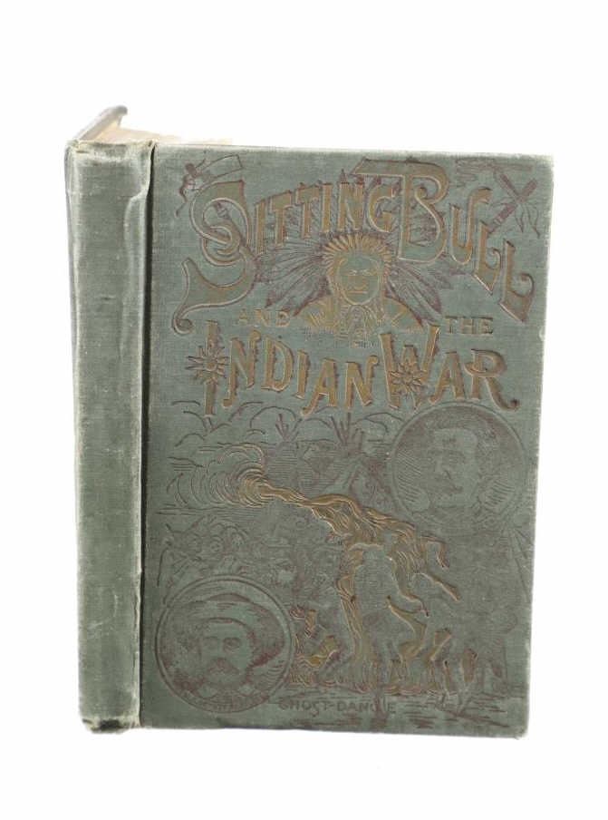 This is a Very Rare Salesman Sample of "Sitting Bull and The Indian War” by W. Fletcher Johnson, 1891. These specimen books were used by the agents of publishers to entice customers to agree to purchase a copy of a work in advance of delivery. This form of marketing was common in America during the years just before and after the Civil War. The book shows the most popular gold gilt embossed front cover showing a portrait of Sitting Bull at the top with a battle scene vignette below, medallion images of both Major General Miles and U.S. Deputy Bartlett. At the bottom of the cover is a vignette of the Ghost Dance, embossed title as such. Insert cards from the publisher describe the binding alternative and also the contents of the actual book, In the back of the book are ledger pages for the salesman to log the subscriber’s signature, residence, style of banding, and price (agreed upon). The green cloth bound gold gilt illustrated stamped hardcover is in nice condition, scuffing and gilt fading exhibited. Intact pages exhibit age tanning and foxing throughout, measures 5.5"W x 8"L x .75"D.