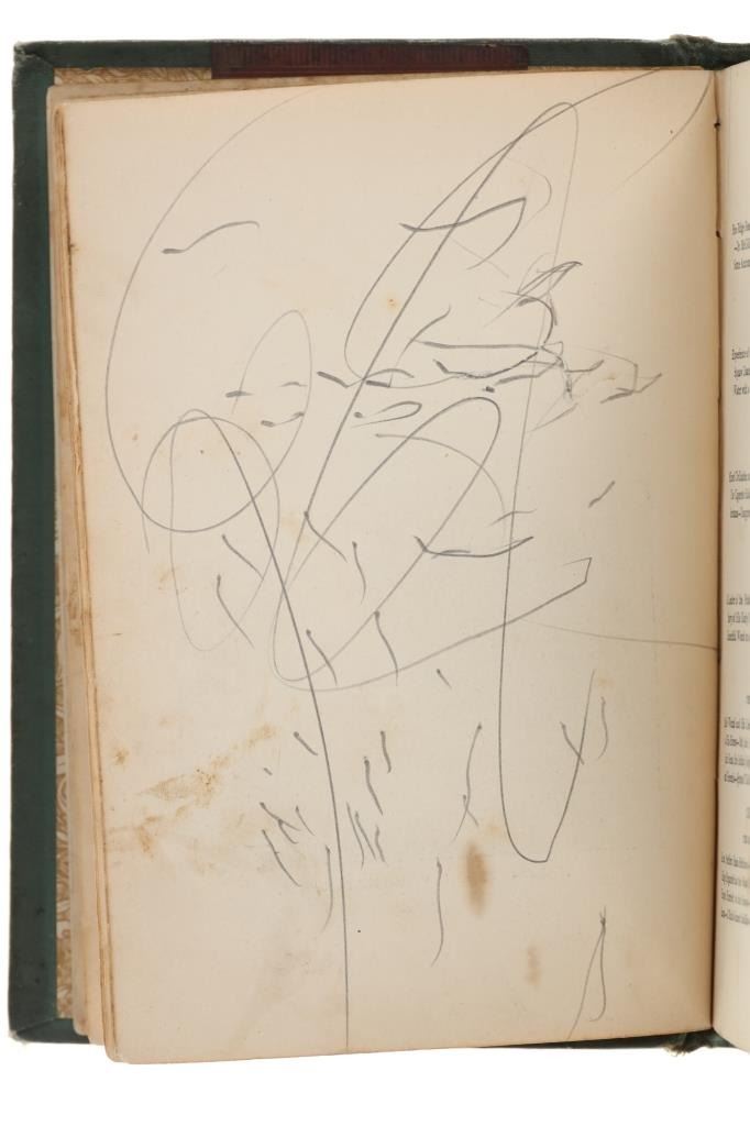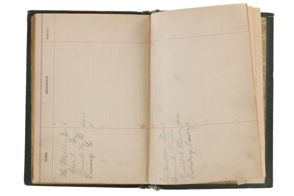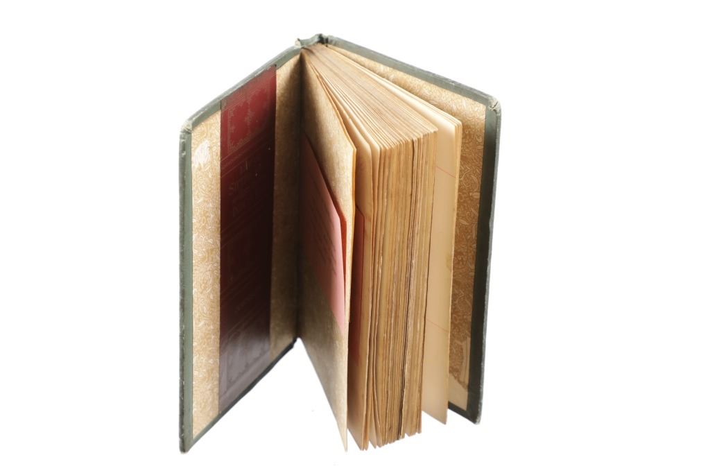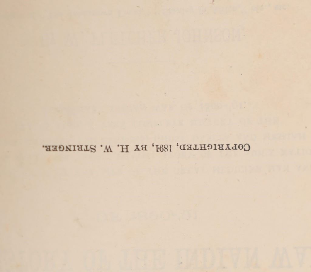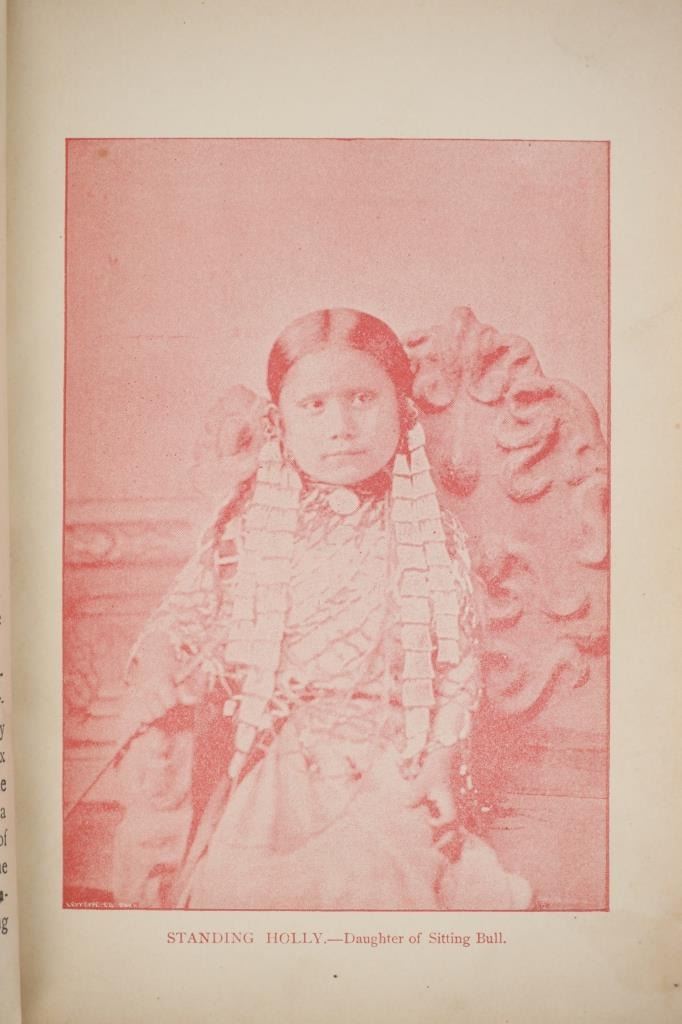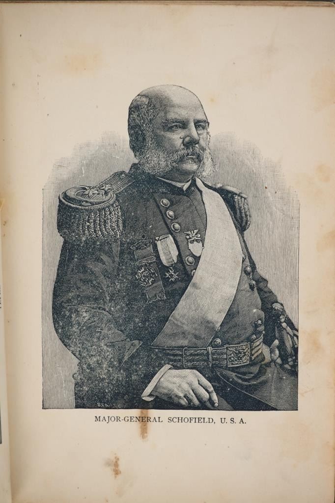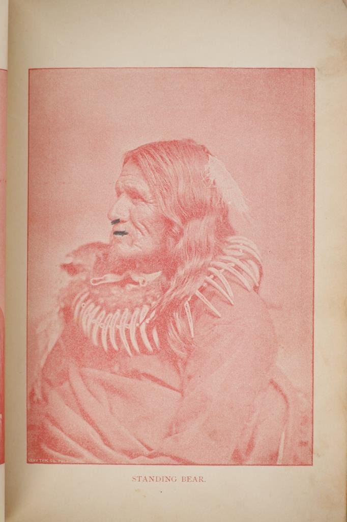 This is a Very Rare Salesman Sample of "Sitting Bull and The Indian War” by W. Fletcher Johnson, 1891. These specimen books were used by the agents of publishers to entice customers to agree to purchase a copy of a work in advance of delivery. This form of marketing was common in America during the years just before and after the Civil War. The book shows the most popular gold gilt embossed front cover showing a portrait of Sitting Bull at the top with a battle scene vignette below, medallion images of both Major General Miles and U.S. Deputy Bartlett. At the bottom of the cover is a vignette of the Ghost Dance, embossed title as such. Insert cards from the publisher describe the binding alternative and also the contents of the actual book, In the back of the book are ledger pages for the salesman to log the subscriber’s signature, residence, style of banding, and price (agreed upon). The green cloth bound gold gilt illustrated stamped hardcover is in nice condition, scuffing and gilt fading exhibited. Intact pages exhibit age tanning and foxing throughout, measures 5.5"W x 8"L x .75"D.