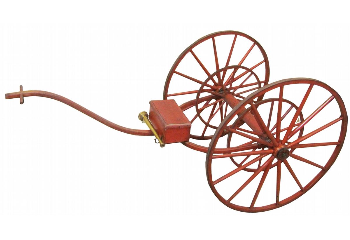 Rare Salesman's Sample Hand Pulled Hose Cart, ca. 1870. We have never seen a Salesman's Sample hose cart. Although unmarked the quality of manufacturing would indicate factory made by Seagrave. What a wonderful piece to enhance the most advanced collection. Very good original condition. 60 inches long including tongue, Wheel diameter 28 inches.
