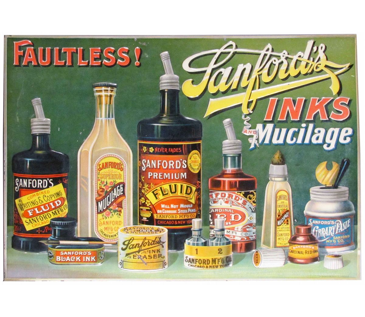 Rare Sanford's Ink Embossed Self Framed Tin Sign. The Tuscarora Advertising Co. Coshocton, OH. Lithographers. Vibrant Color and Graphics. One inch scratch at 7:00 and a couple of very slight chips otherwise excellent condition. 19 1/2 X 13 1/2 inches.