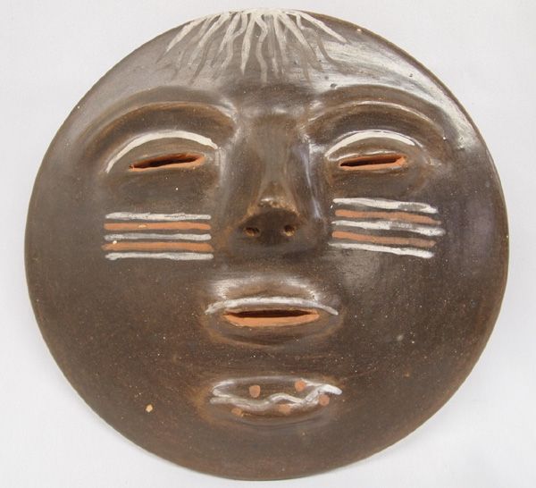 Rare Santa Clara Painted Pottery Face Plaque. 8'' diameter and 1.5''H at the nose, this unusual plaque has one small chip on the chin but otherwise in good condition.