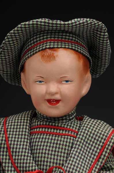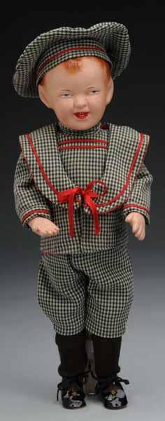 Description American, Ca. 1912. All wood jointed character with impressed Schoenhut mark on back torso. Head has been totally restored. Nicely redressed in wool suit, replaced shoes. Condition (Good). Size 16" T.